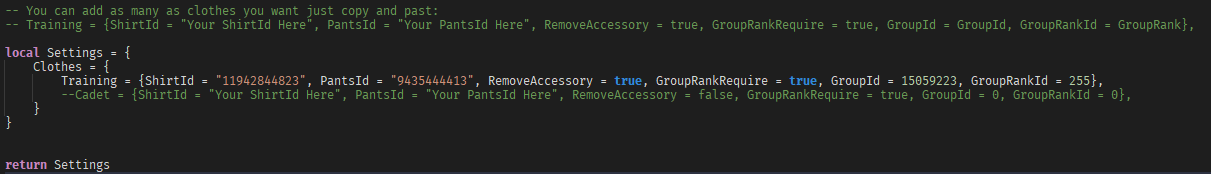 Uniforms giver designed for military roleplay games. Allow your players to wear/change clothing. Comes with group lock/rank lock/team lock. You can add as many clothes as you want.