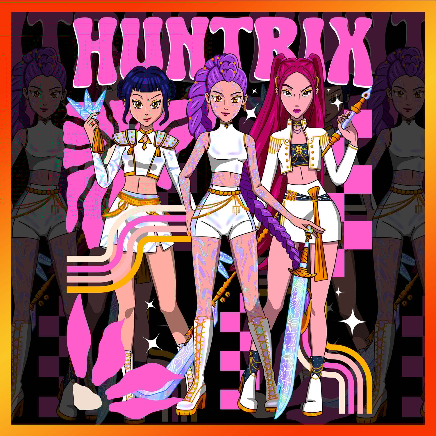 Step into the futuristic world of Huntrix: KPOP Demon Hunters, where fashion, anime, and urban fantasy collide! This exclusive artwork is inspired by vibrant K-pop aesthetics and bold anime vibes, making it perfect for fans, creators, and merchandising designers who want something unique and eye-catching.