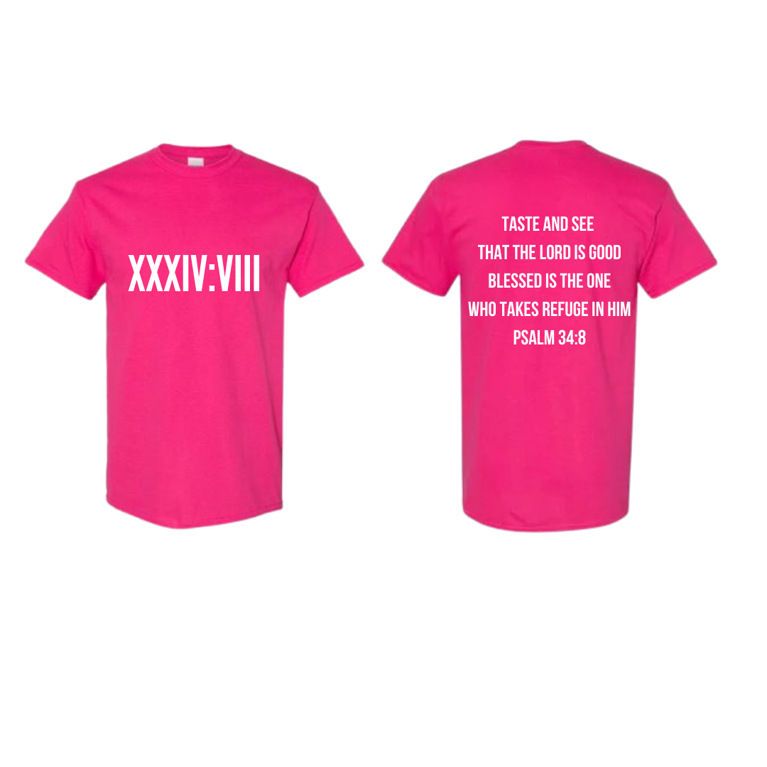 Experience faith and style combined with our **Psalm 34:8 Pink T-Shirt**. Featuring the timeless scripture "Taste and see that the Lord is good" in bold, elegant lettering, this shirt is perfect for sharing your faith wherever you go.