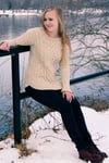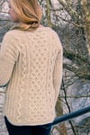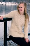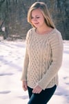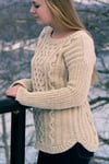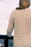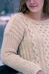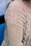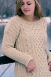 Size: 31 (35, 39, 43, 47, 51, 55)” bust; shown in third size worn with 4” of positive ease. For a similar fit, choose a size with several inches of ease; the cables and rib will conform gently to the body, while still maintaining a relaxed silhouette.