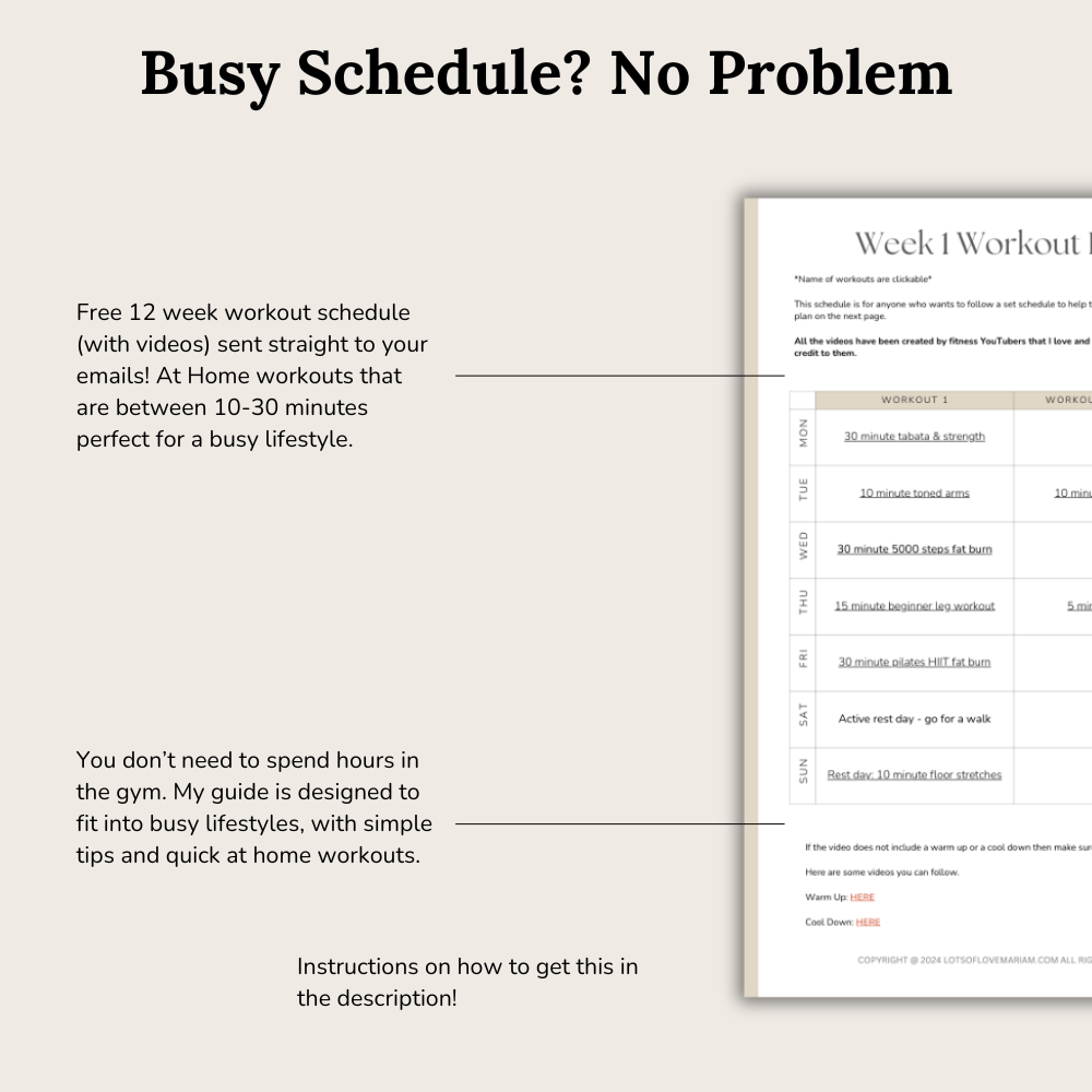 - When you purchase this product, you will receive a FREE 12-week workout schedule via email. This workout schedule includes workout videos I have personally used (and still use today) that helped me during my 20 kg weight and fat loss journey!