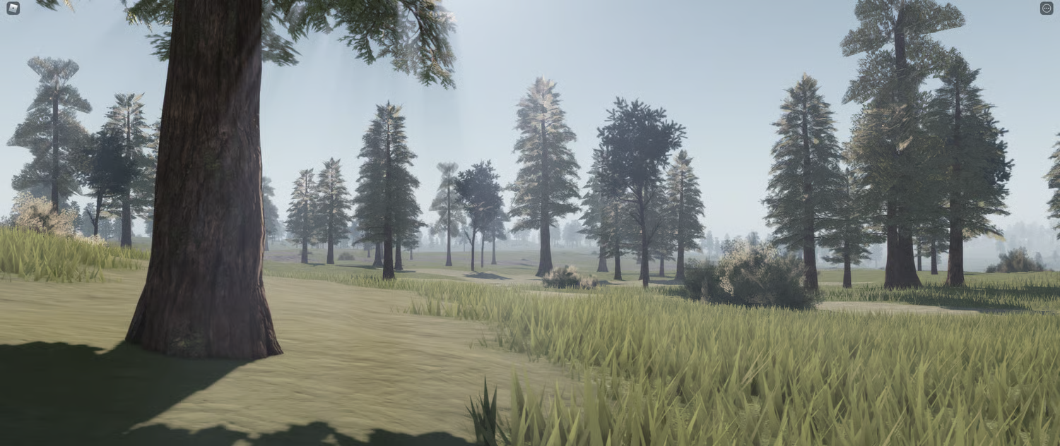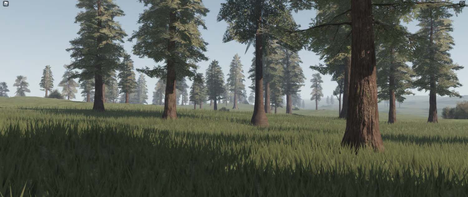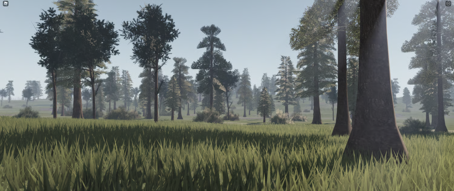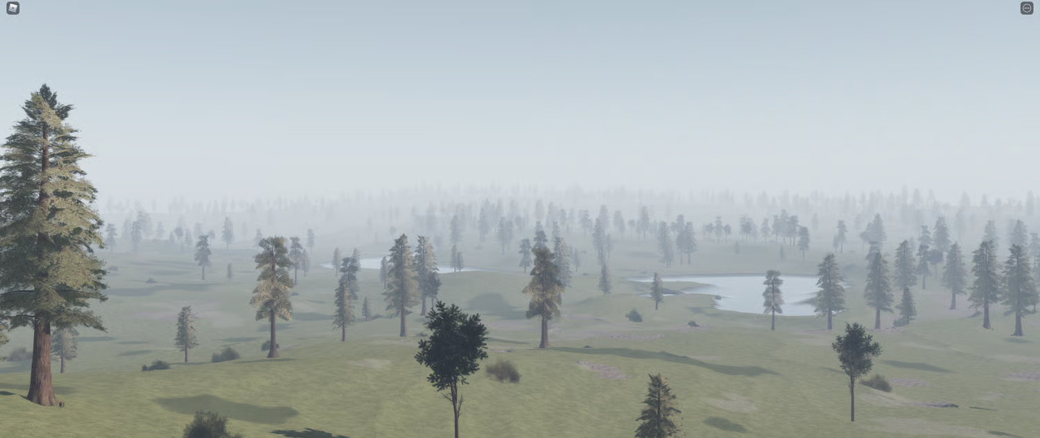 Verdant Wilds is a large-scale, realistic open world terrain map spanning 14k x 14k studs. It's built around wide open meadows, dense mixed forests, scattered ponds, rolling hills and a bright, natural lighting setup that makes the whole thing feel alive. The grass, the trees, the fog in the distance — it all holds up at ground level and from above.
