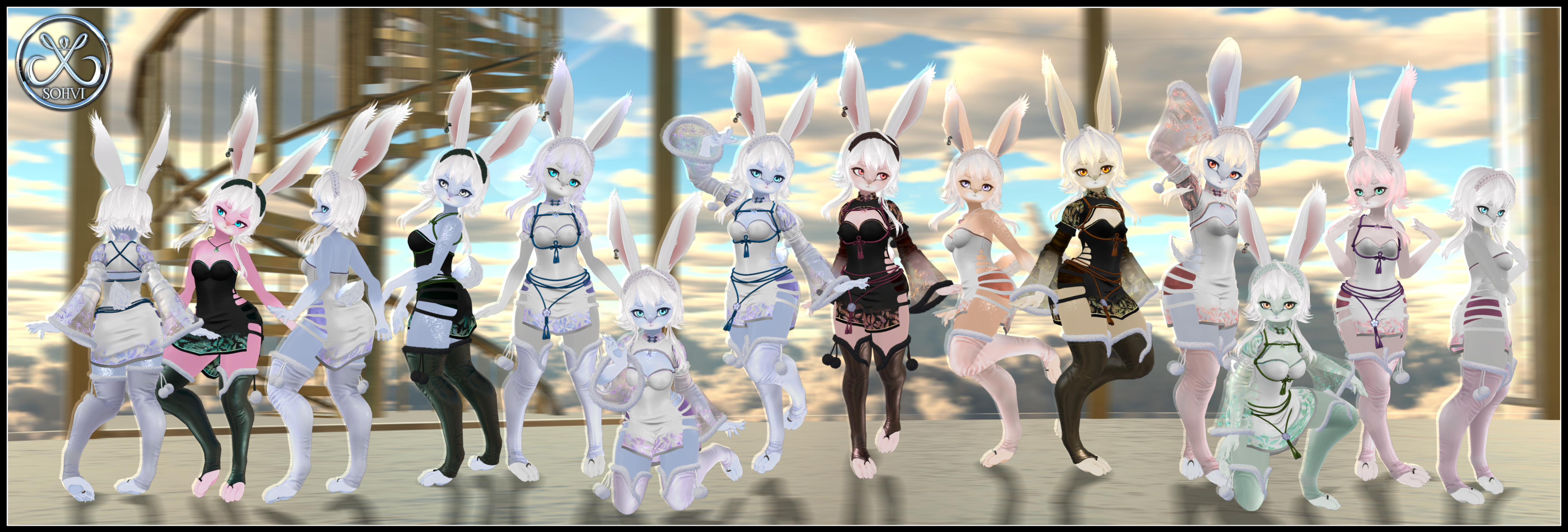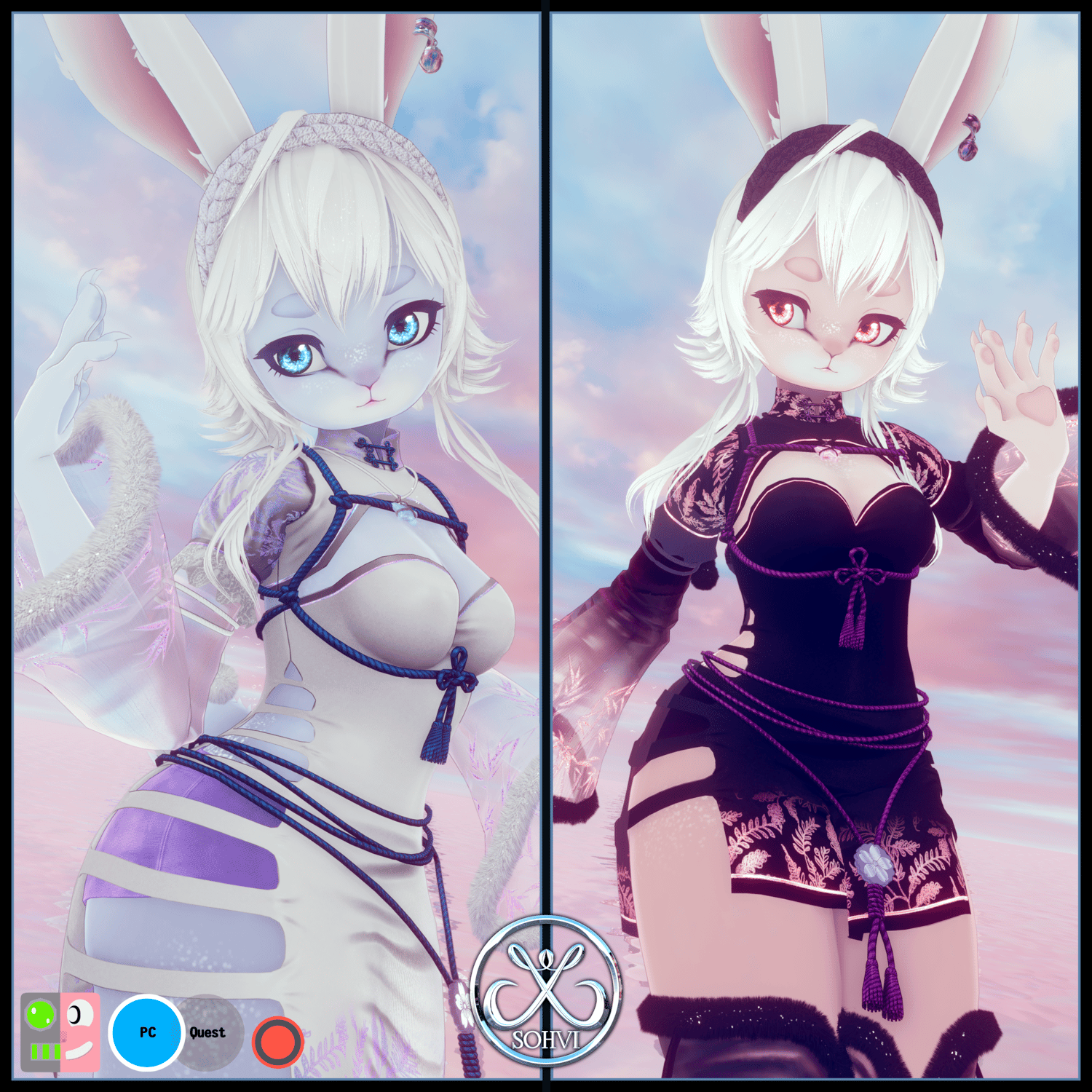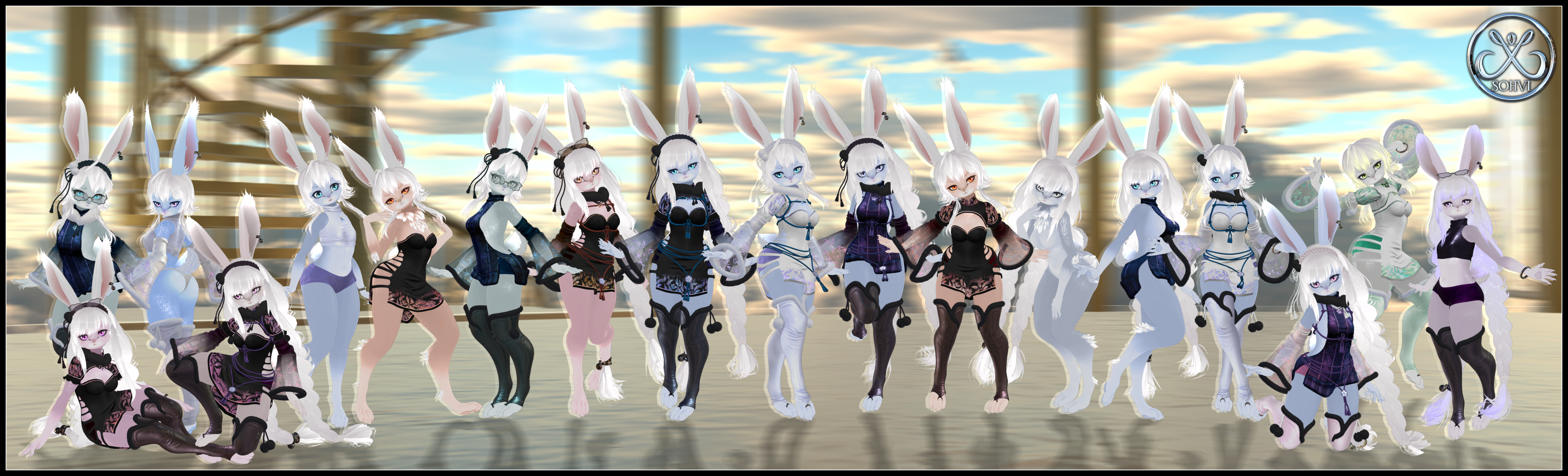VRChat female bunny furry avatar. Unity 2022, 7 custom expressions, write defaults off. Physbones, Twist bones, Volume bones, jiggles where expected + moving clothing details etc. Lots of scratch assets, Gogo Locomotion