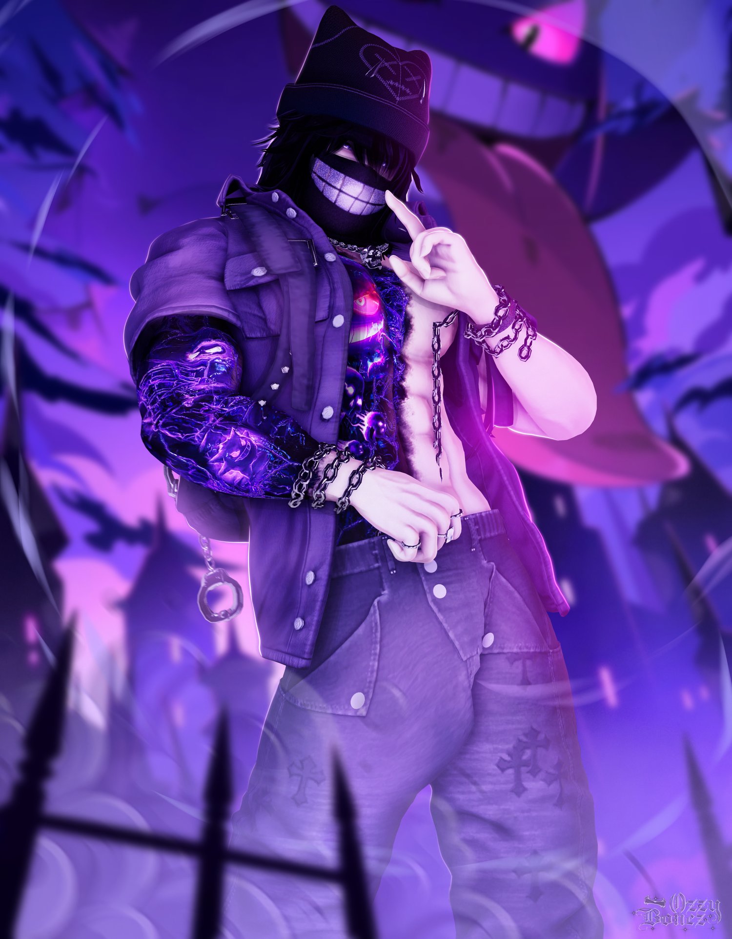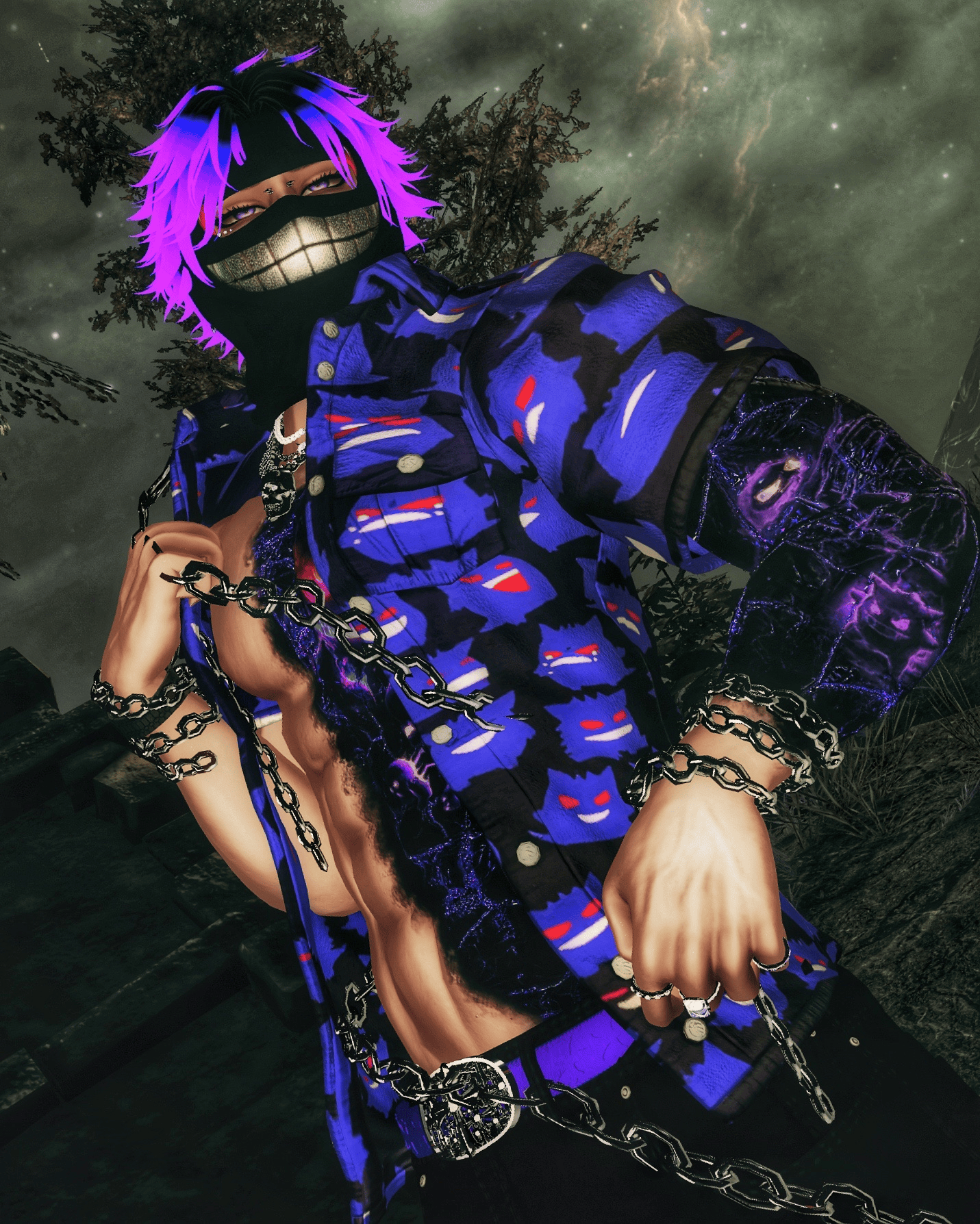 Fitted tee toggle, Hair toggles, Hair colors and shifts, Tats on and off, backpack, jewelry, balaclava, belt, horns, skull chain, rings, chains etc