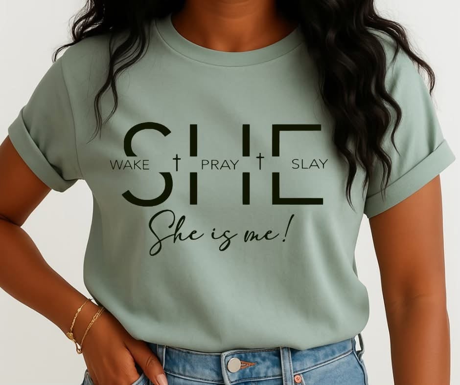 Faith, strength, and style — all in one design! This “SHE Wake Pray Slay, She is Me!” screen print is perfect for the woman who starts her day with prayer and ends it with purpose. The bold typography and elegant script blend effortlessly, creating a powerful message of confidence and faith.