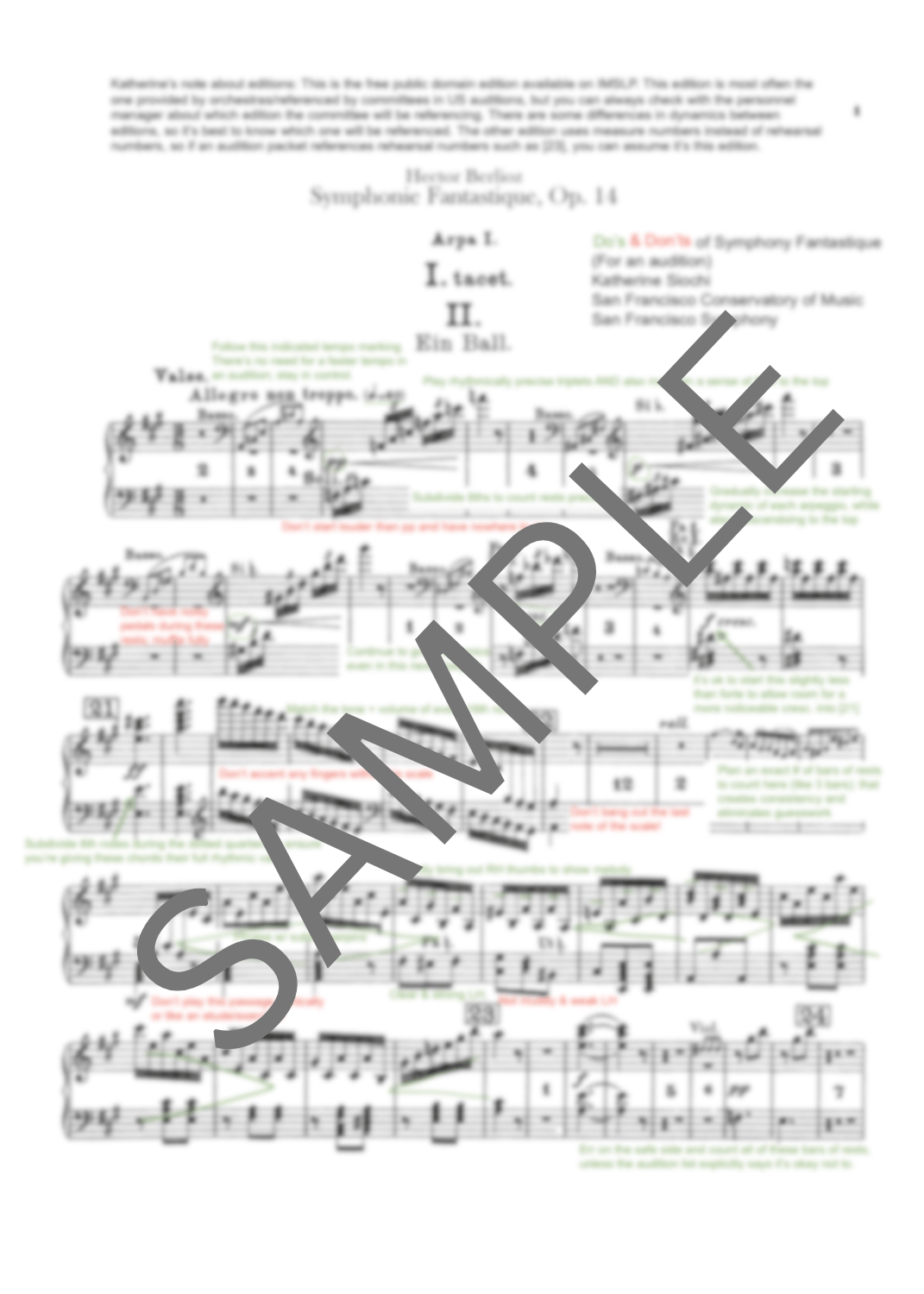 This annotated PDF breaks down the harp part from Berlioz's Symphonie Fantastique (the #1 most frequently appearing audition excerpt!) with color-coded tips overlaid directly onto the score. The guide is designed to help a harpist prepare this excerpt specifically in an audition context. Green annotations show recommendations on what to do; red annotations point out common mistakes to avoid. Created by Katherine Siochi (San Francisco Symphony/San Francisco Conservatory of Music), this guide distills years of firsthand experience auditioning with this excerpt, as well as coaching other harpists on it and recognizing the most common pitfalls. It covers dynamics, rhythm, tempi, phrasing, technique, and interpretive suggestions to help you feel confident and prepared at your next audition.