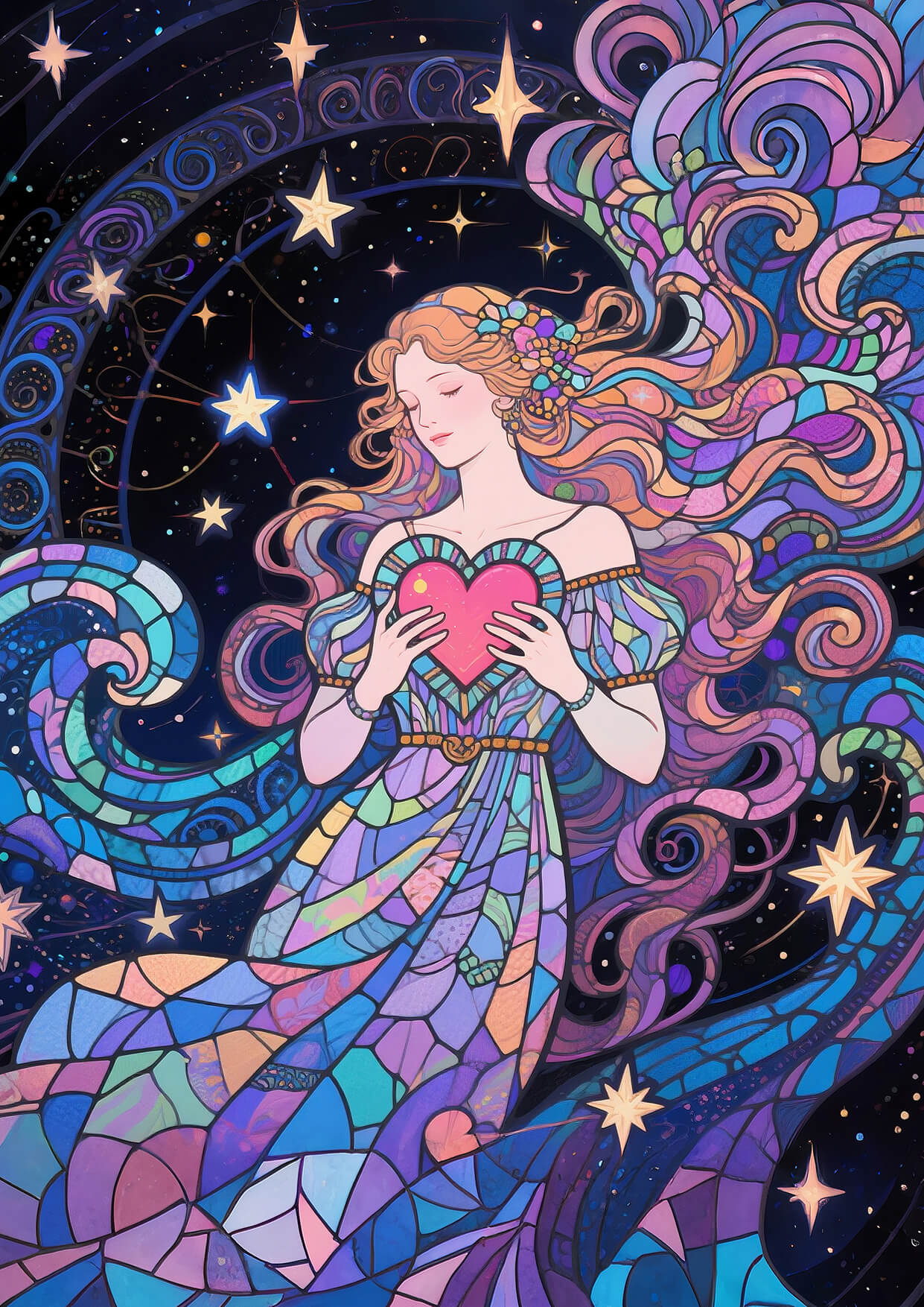 A beautiful goddess with flowing hair tenderly embraces a heart of love, surrounded by swirling stars, cosmic waves, spirals, and luxurious celestial patterns.