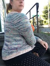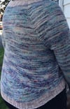 The cardigan is worked from the top down with raglan increases. Colors A & B are held together to create a marled effect. If you choose to knit this with DK weight yarn instead, you will only need one strand of yarn throughout the pattern.