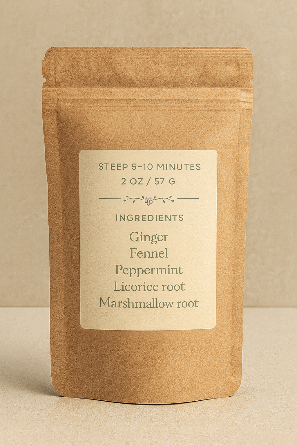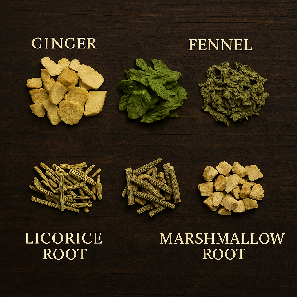 Ingredients: Ginger, Fennel, Peppermint, Licorice Root, Marshmallow Root