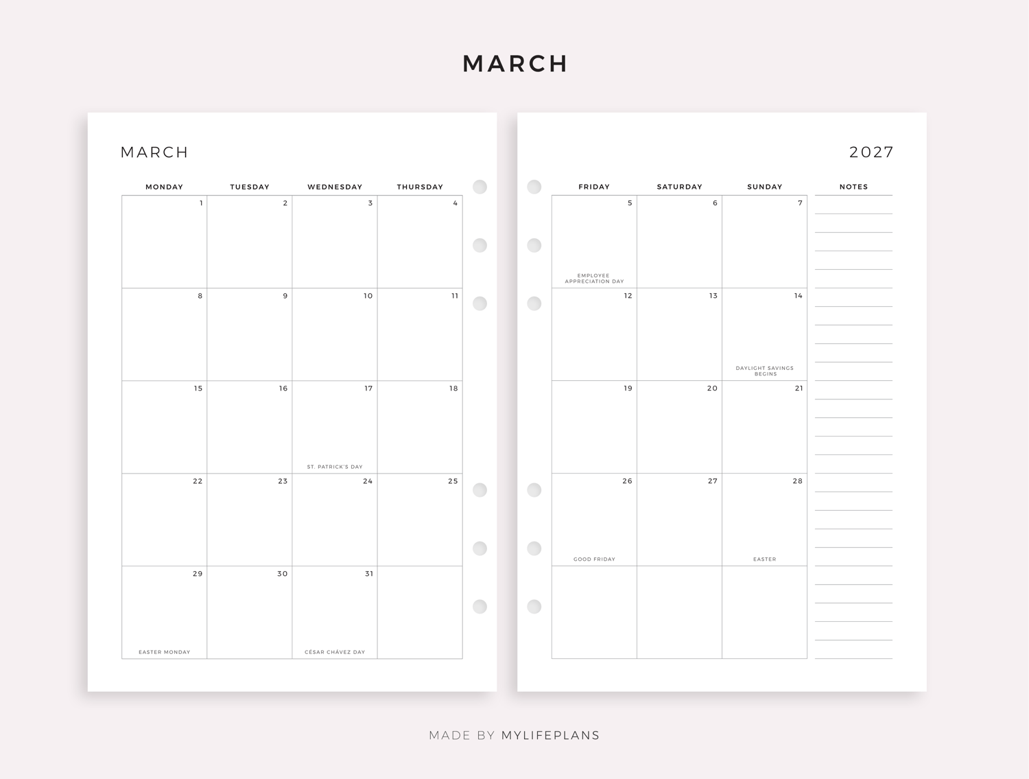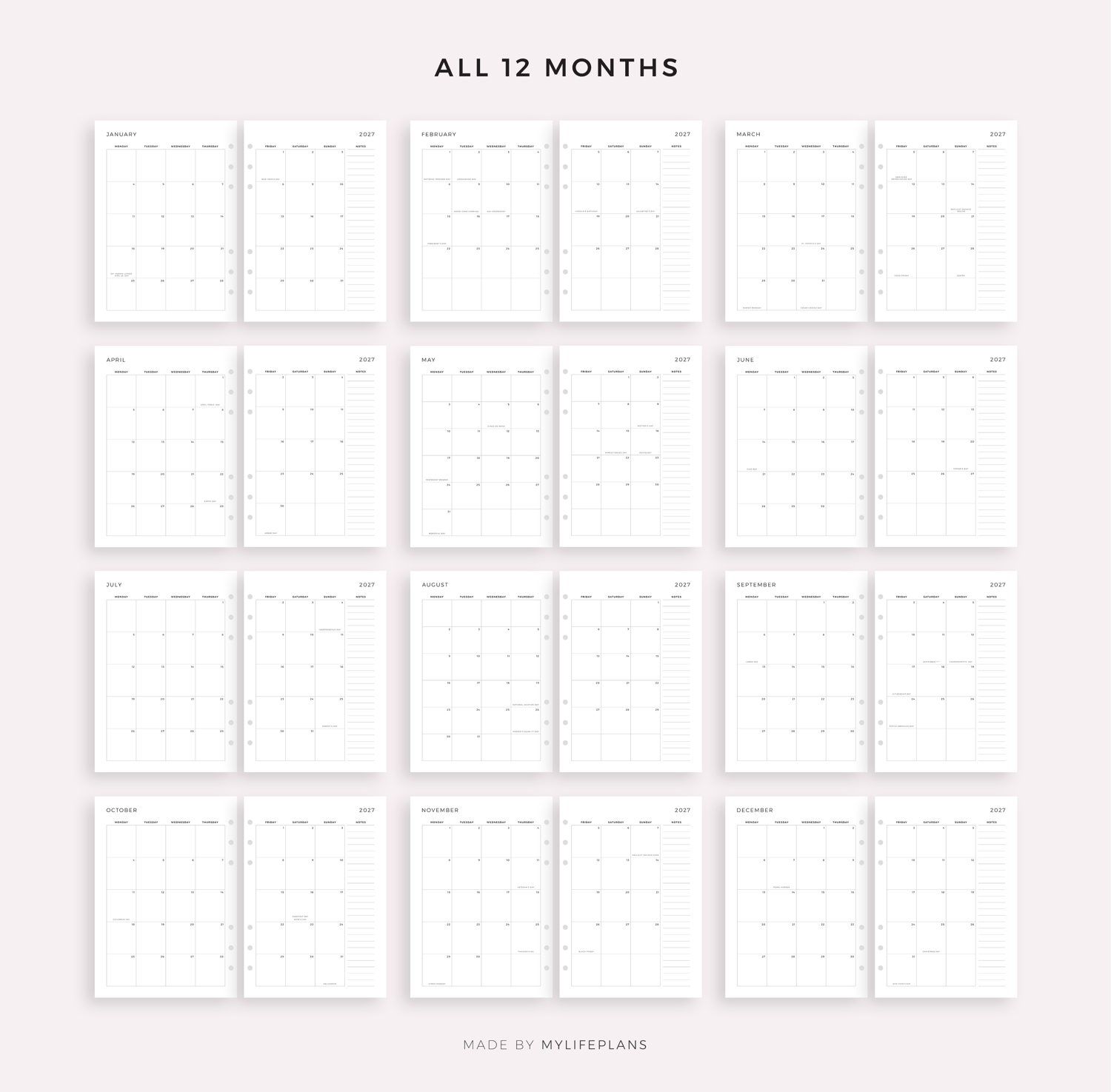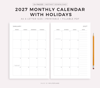2027 Monthly Calendar with Holidays on 2 Pages, Printable & Fillable, A4/Letter Size