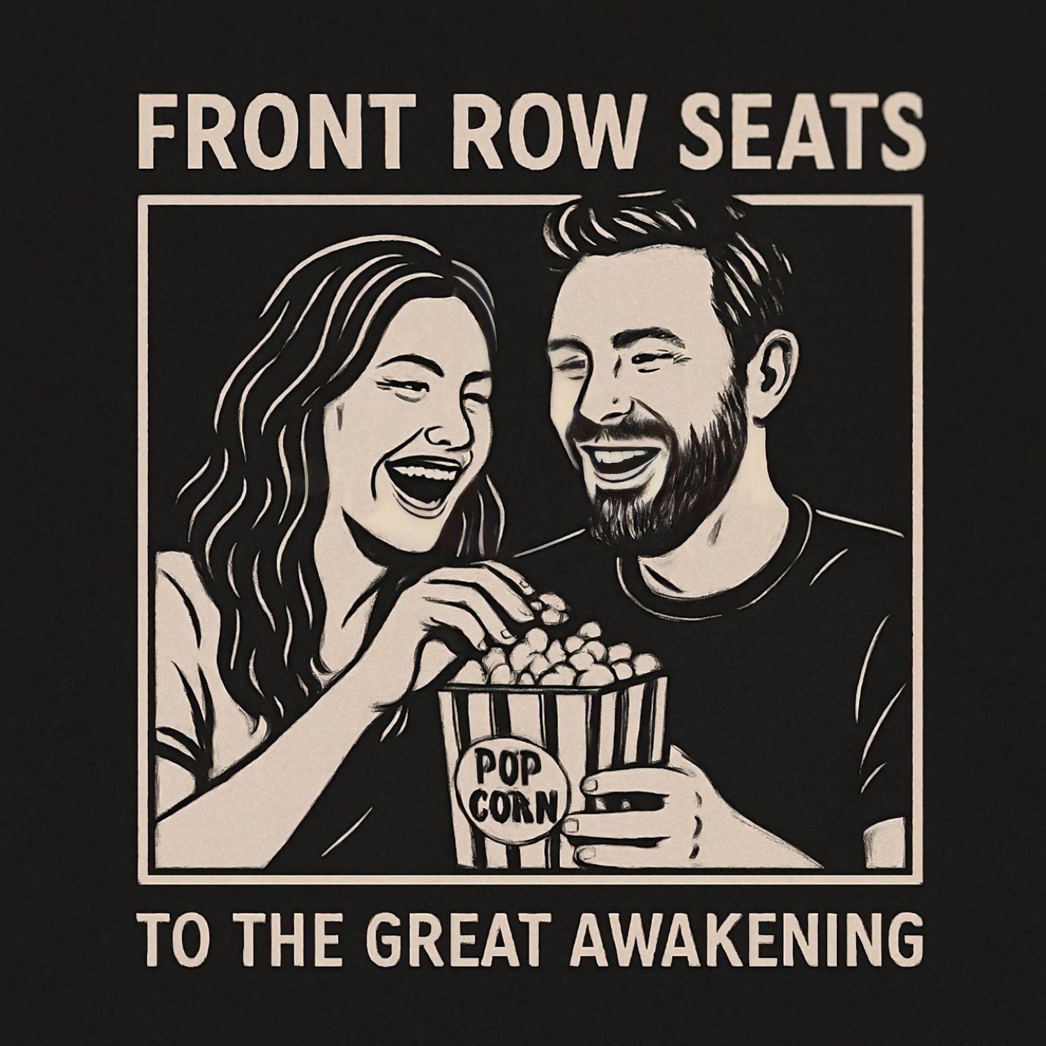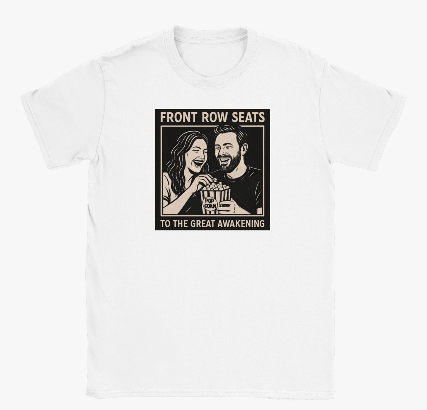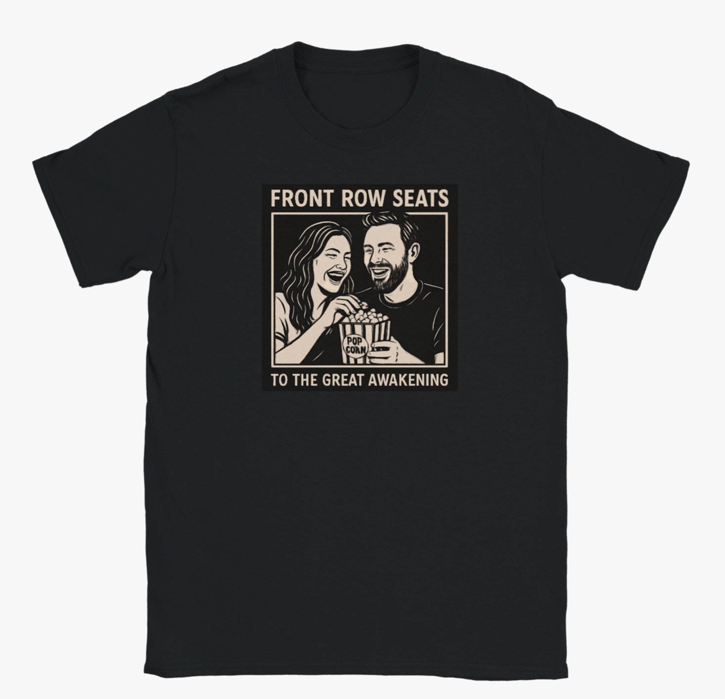 Celebrate a moment of shared awareness with this bold, retro-inspired graphic tee. The design features an illustrated couple enjoying popcorn with the caption “Front Row Seats to the Great Awakening,” symbolising people coming together to witness a new wave of understanding, connection, and collective awakening across humanity.