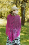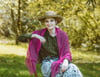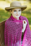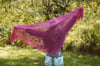 This triangular shawl has an unusual construction. Knitting starts in the middle with the base of the central leaf panel, followed by floral triangles to left then right of center, before more flowers are sprayed across the bottom of the shawl, leading up to the lower edge. A wide applied border is added as a final finishing touch.