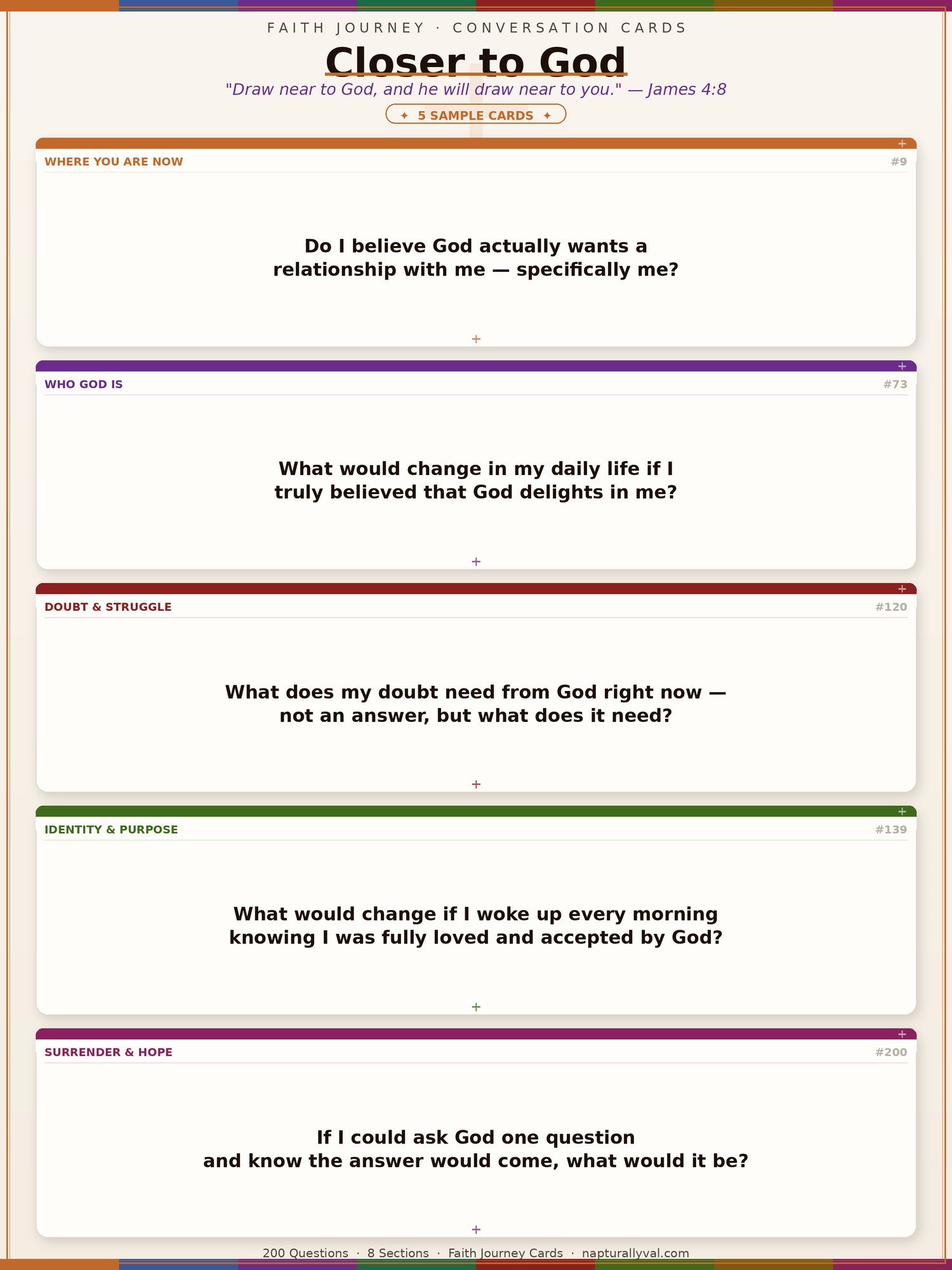 Whether you feel close to God or completely distant, these 200 conversation cards meet you exactly where you are and walk with you back into intimacy, clarity, and truth. No pressure. No performance. Just raw, personal connection.