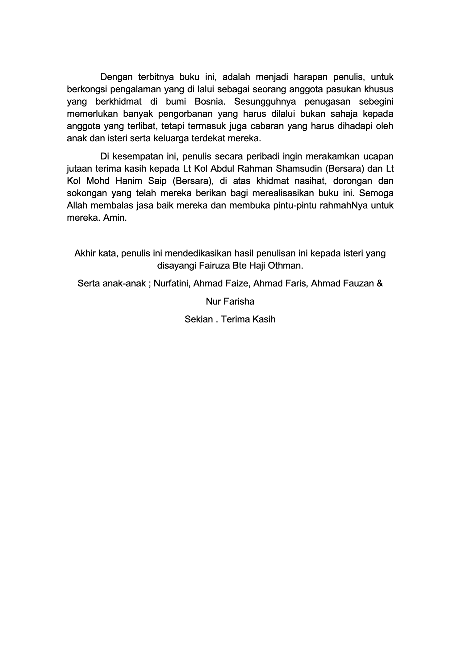 Buku "Misi di Bumi Bosnia" membawa anda menyelami pengalaman sebenar seorang anggota pasukan elit 11 Rejimen Gerak Khas (RGK), Angkatan Tentera Malaysia (ATM) dalam salah satu misi paling bersejarah dan berbahaya di bumi Bosnia & Herzegovina selepas berakhirnya konflik berdarah pada tahun 1996.