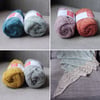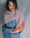 Lastly, stitches are picked up along the remaining edge and worked in a simple lace patterning.This results in a beautiful scalloped edge along one side of the shawl, providing an elegant contrast to the linear garter rib sections.