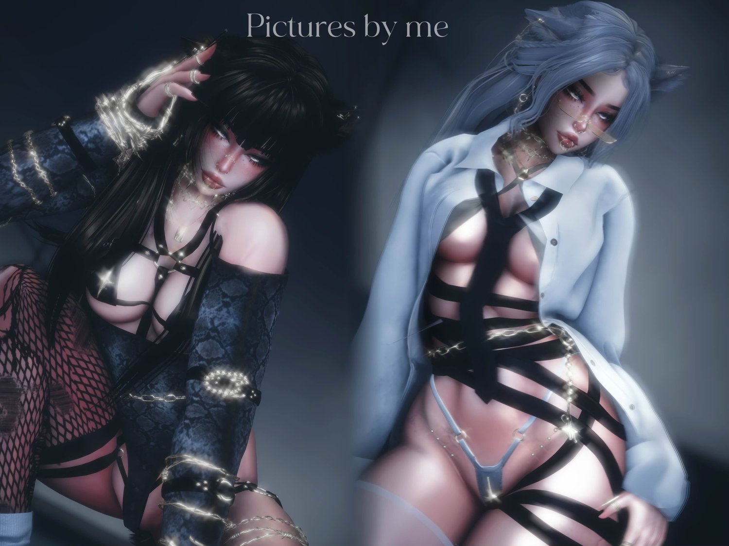 Body accessories (rings, necklace, harness, wrap, chain arms, chain waist, chain legs, kneepad, bracelets, arm straps)