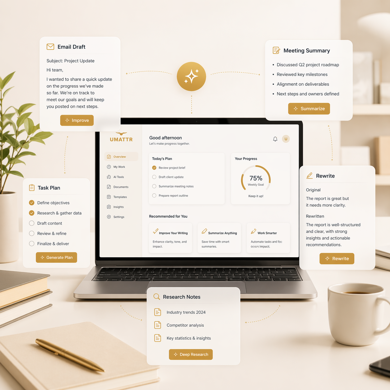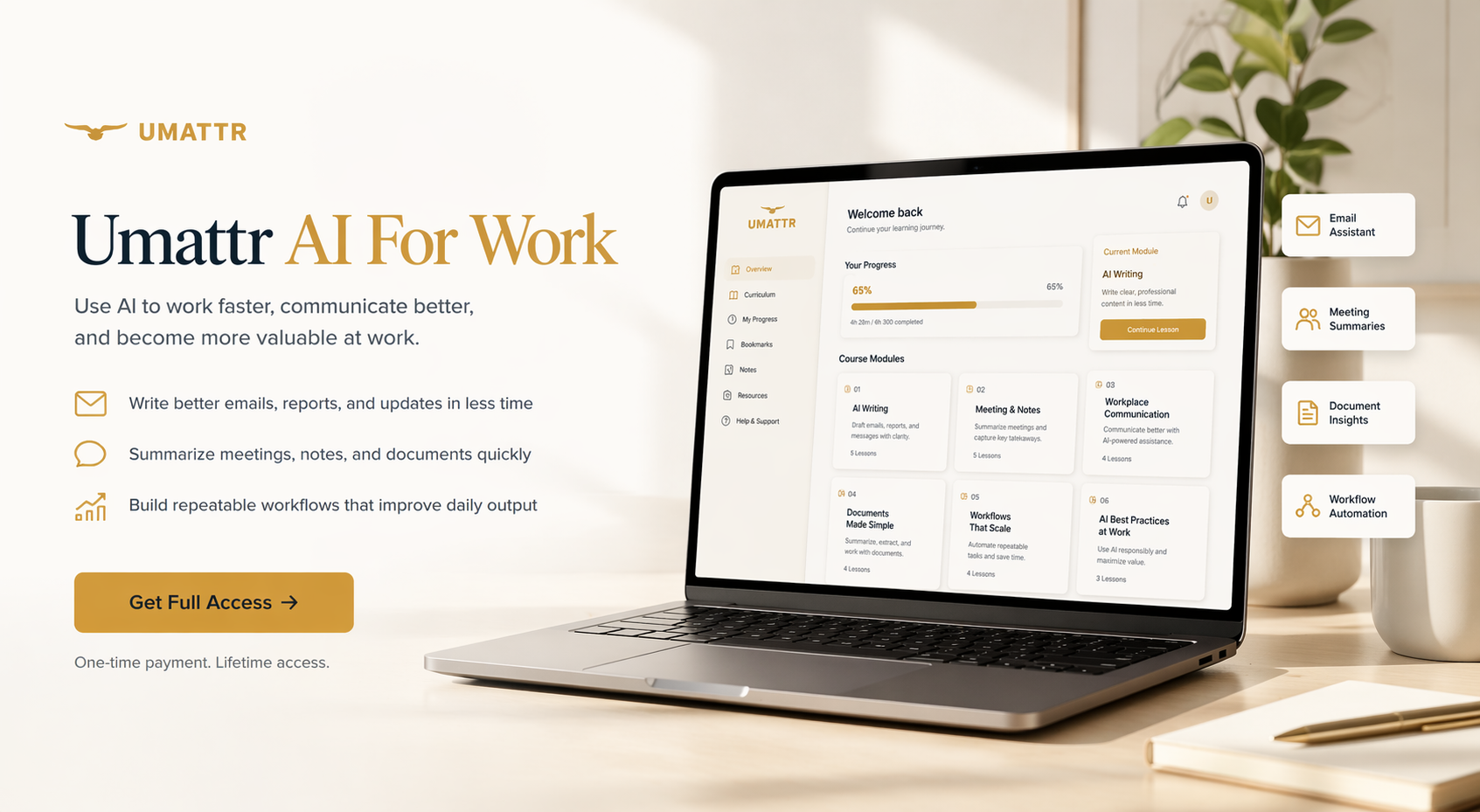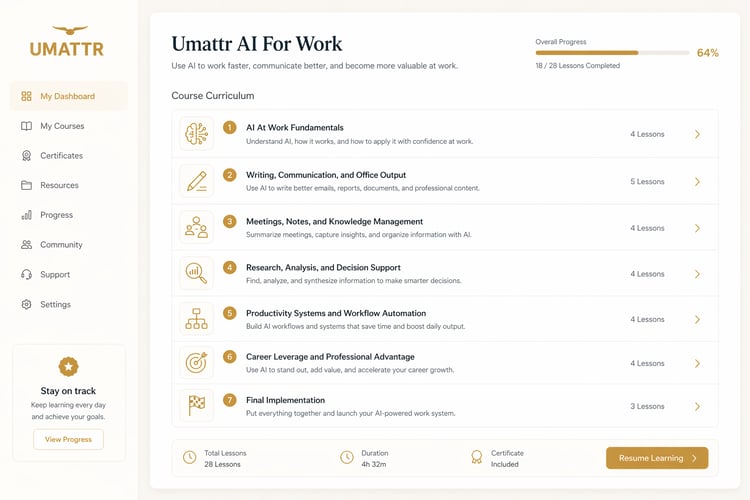 Umattr AI For Work is designed for people who want to use AI in real work, not just experiment with it. Learn how to write better, communicate more clearly, summarize information faster, and build repeatable workflows that improve your daily output. The focus is practical execution, professional quality, and real workplace value.