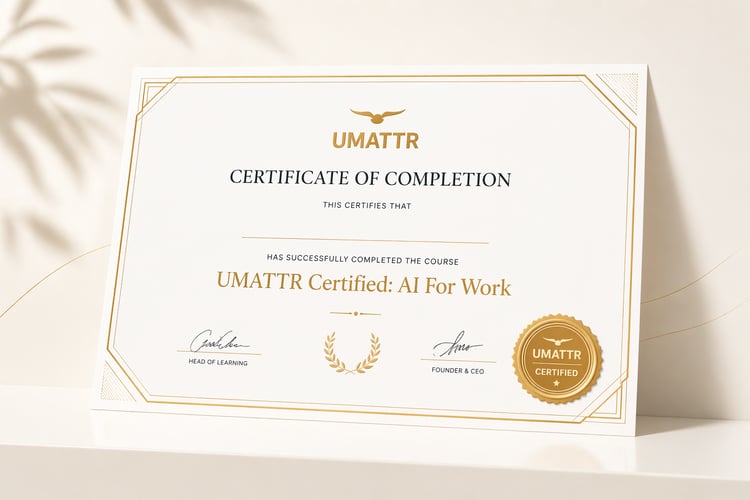 Complete the course and receive UMATTR Certified: AI For Work, a professional certificate that reflects practical understanding of AI tools, workplace applications, and real-world workflows. It gives your learning a clear outcome and a stronger signal of applied capability.