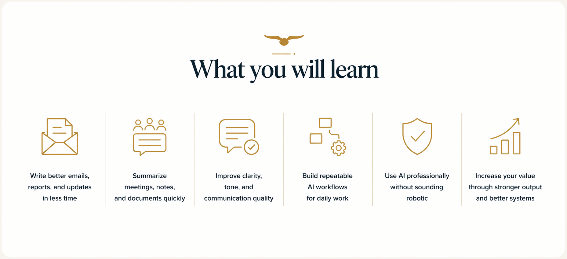Move through a clear learning path built around the way professionals actually work. From writing and communication to meetings, research, workflow design, and professional leverage, each section helps you apply AI with more confidence, consistency, and purpose.