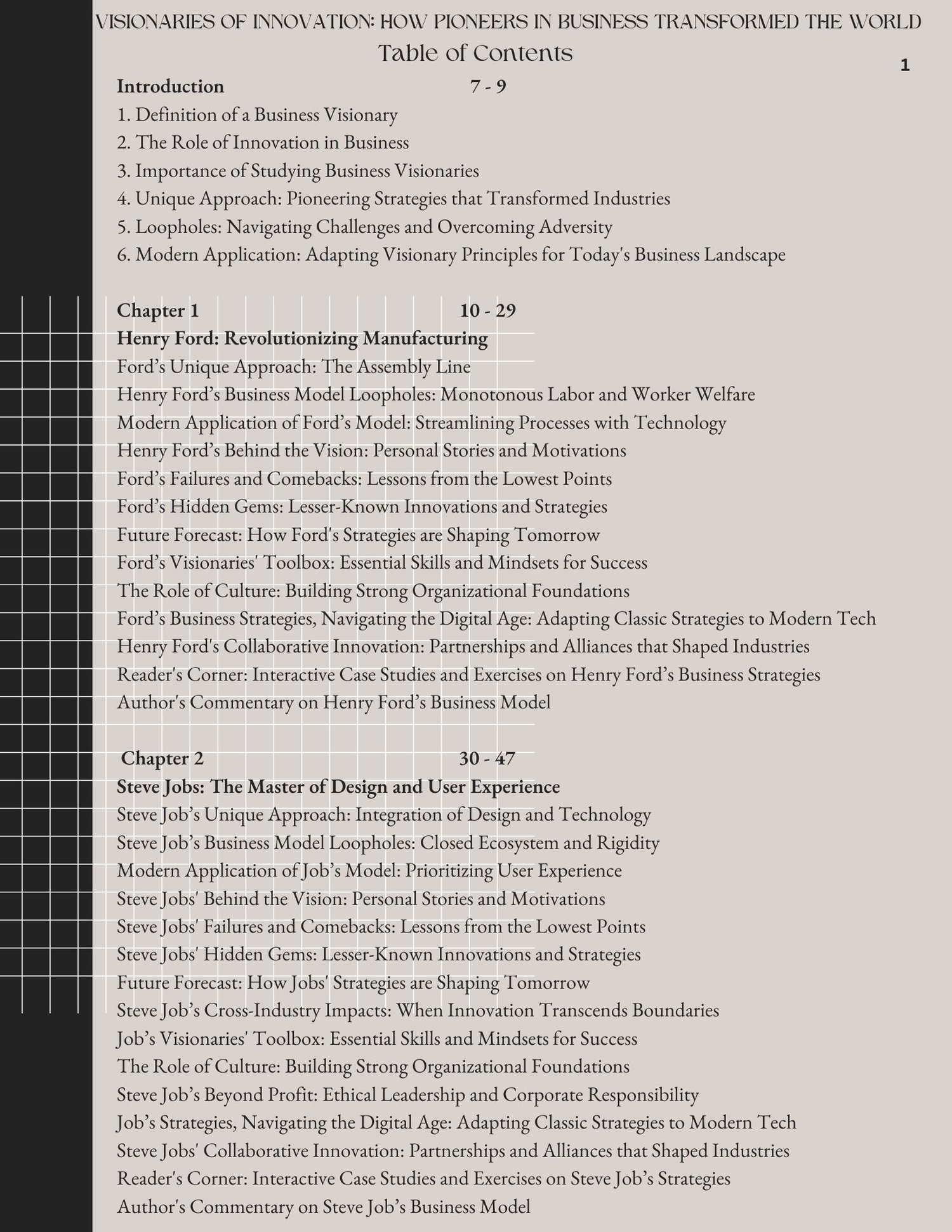 Unlock the secrets to success with "Visionaries of Innovation: How Pioneers in Business Transformed the World." This insightful eBook delves into the lives and strategies of some of the most influential business leaders who have reshaped industries and set new standards for excellence.