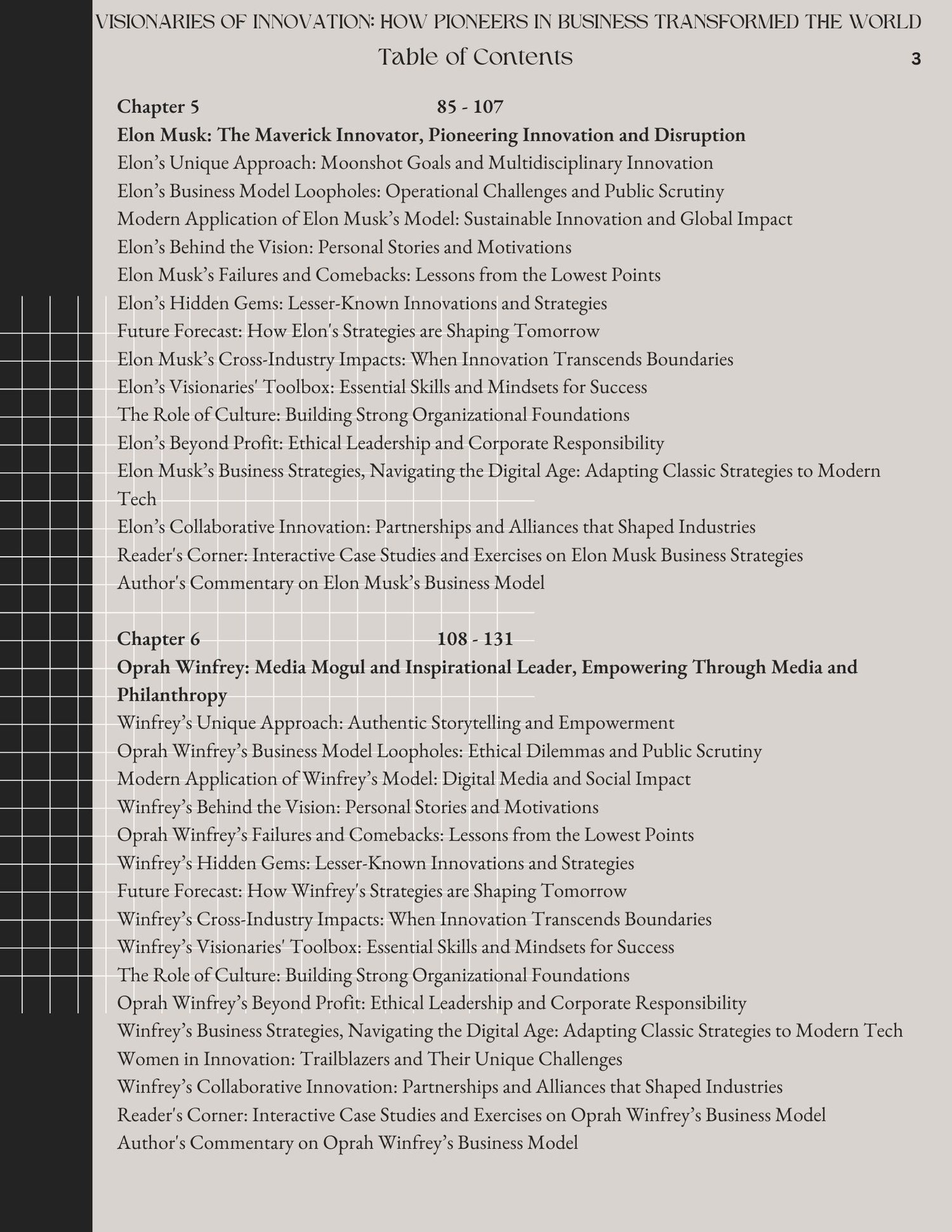 "Visionaries of Innovation" is a must-read for aspiring entrepreneurs, business leaders, and anyone seeking to understand the transformative power of innovation and strategic thinking. Whether you're looking to launch a startup, grow an existing business, or simply gain a deeper understanding of what drives success, this eBook offers a wealth of knowledge and inspiration to help you navigate your own path to greatness.