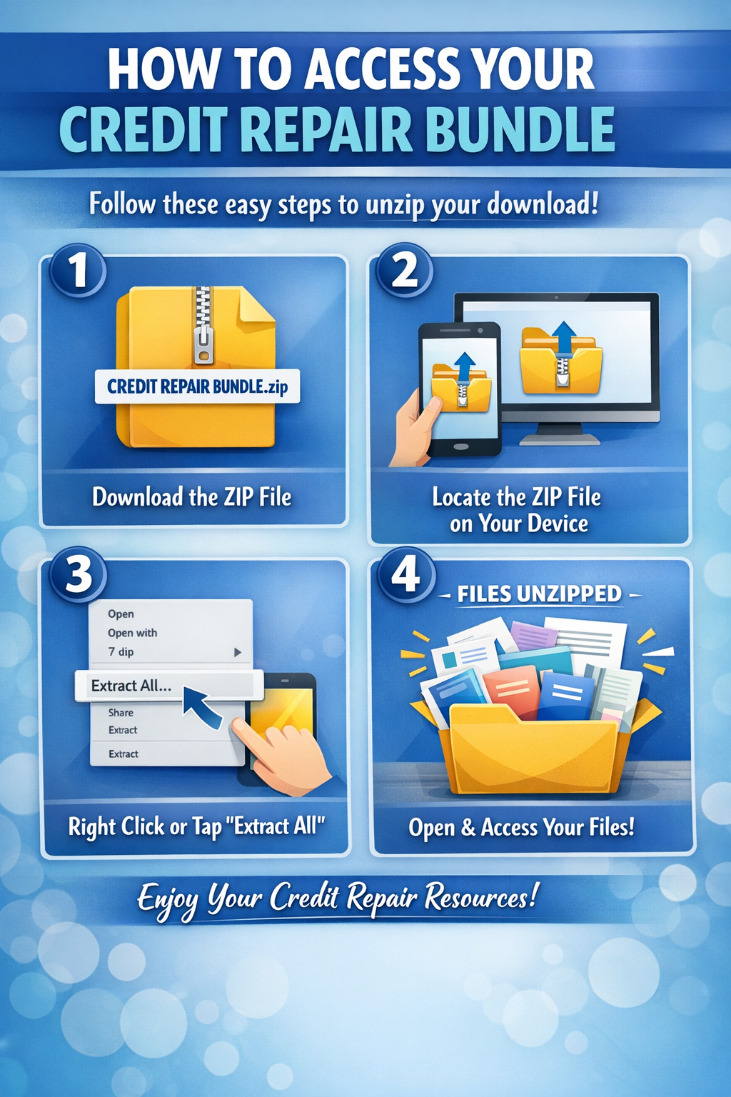 After purchasing, you will receive your Credit Repair Bundle as a ZIP file. Please follow the steps below to access your files: