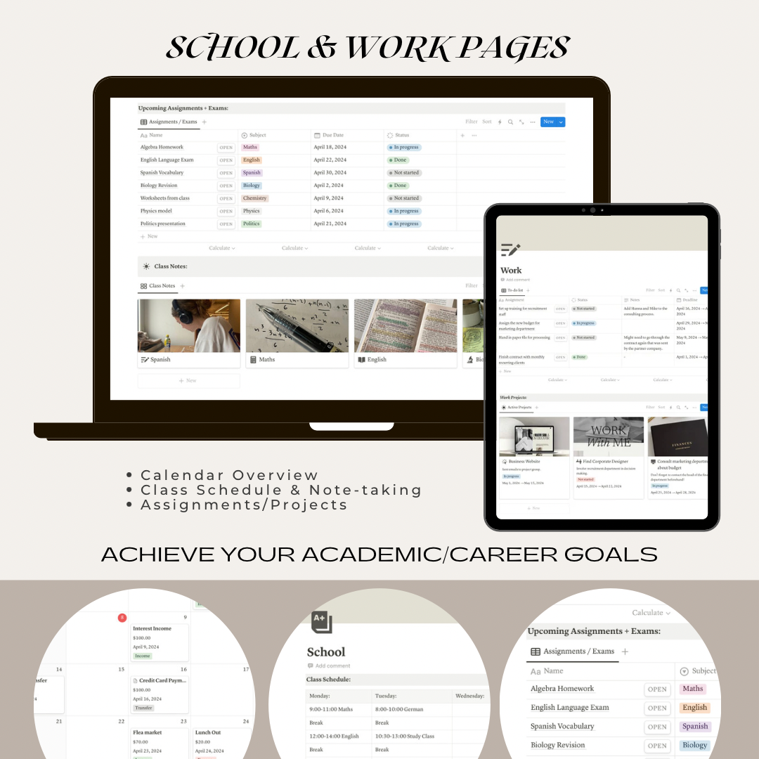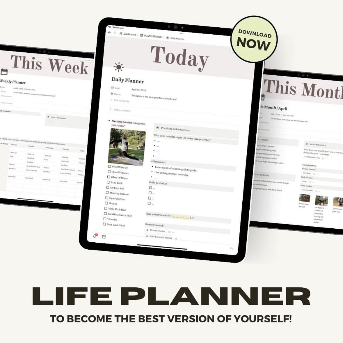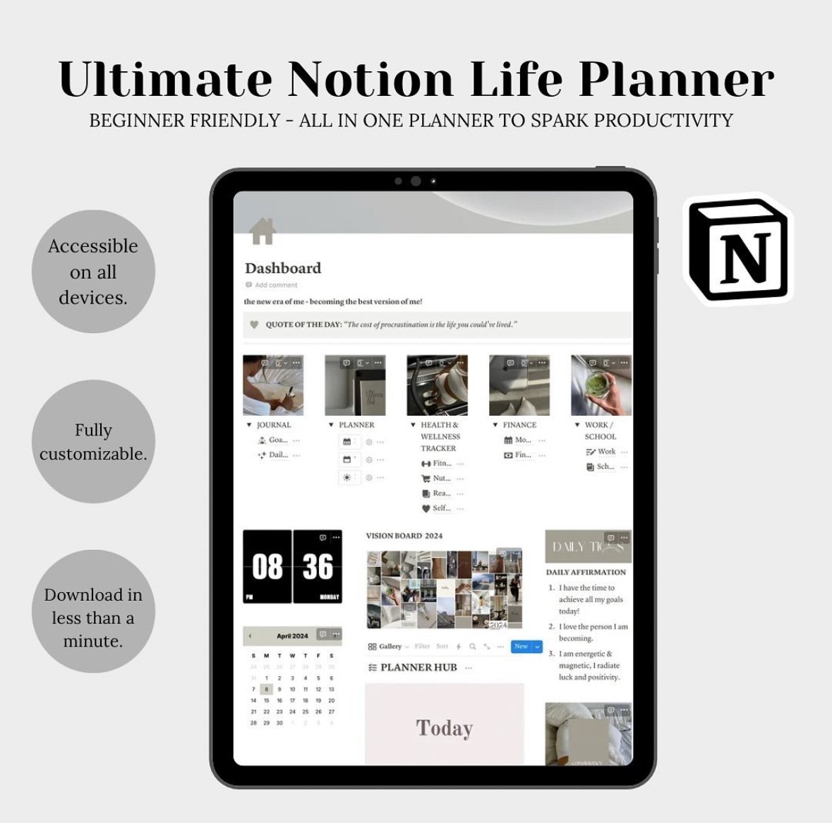 The Ultimate Life Planner (all-in one notion template) will help you get back on track in every aspect of your life. It can easily be used on any device (laptop, phone, tablet…) and can be customised with your own information and pictures. This planner will motivate you and help you become the best version of yourself & finally achieve your goals this year.