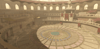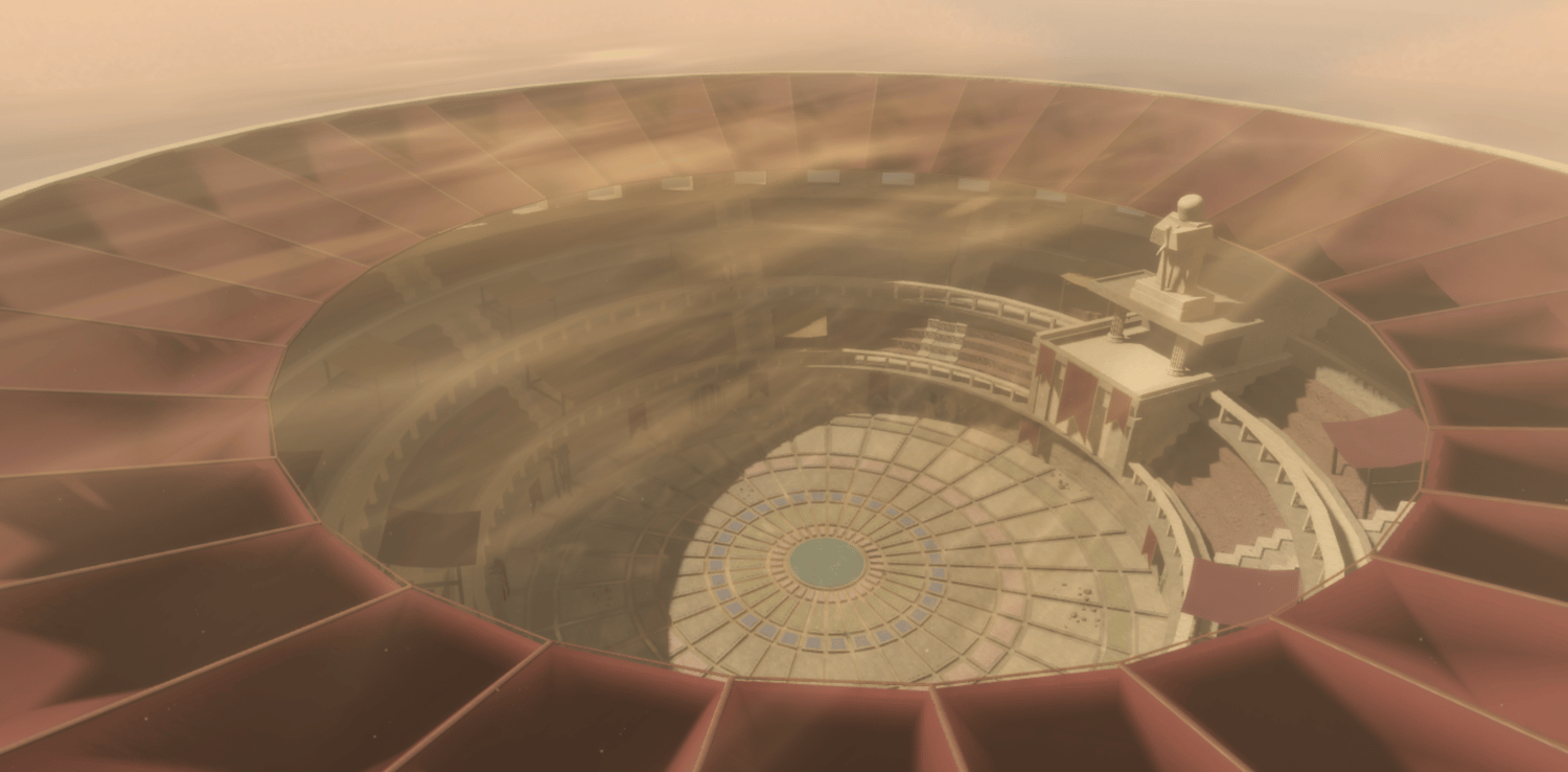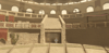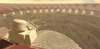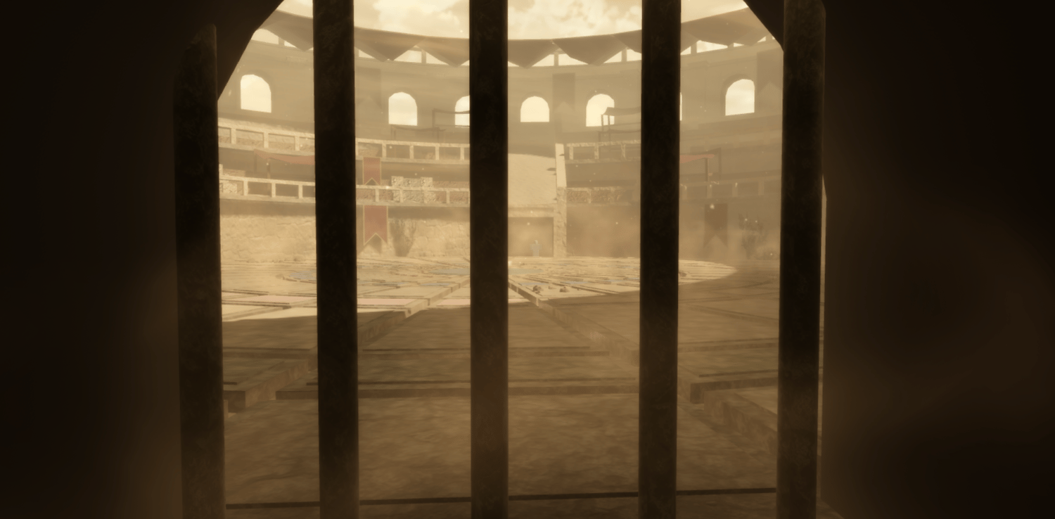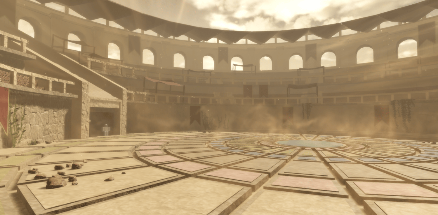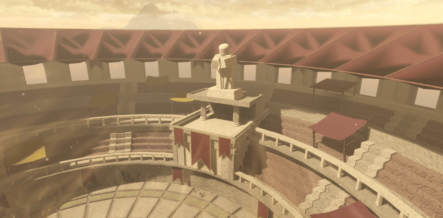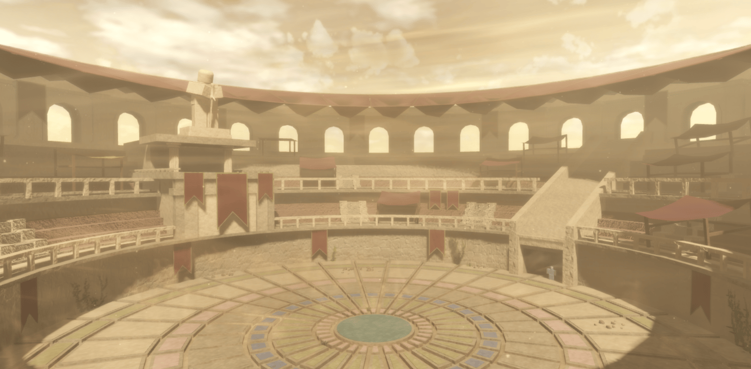 A grand Roman gladiator arena featuring a detailed colosseum structure with multi-tiered arched seating, decorative red banners, and imposing statues overlooking the battle floor. Warm sandstone tones and dramatic lighting create an epic ancient atmosphere, while intricate floor patterns and underground entrance tunnels add authenticity. Spacious circular arena provides ample combat space with scenic backdrops from every angle. Perfect for fighting games, anime battlegrounds, boss arenas, PvP zones, or Roman-themed projects.