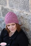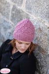 The hat has a decorative ribbing. The 4-st cables are great for beginner cable knitters and can be knitted without a cable needle. The bubbles (double moss stitches) are made simply by altering knit and purl stitches. A pompom on top can add extra cuteness to it. It is a quick one-skein project. The cable patterns add extra thickness, perfect for the colder season.