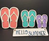 Flip Flop set for interchangeable Wagon includes 3 sizes of flip flops and a Hello Summer Sign with two hooks. they range in size from 3~8" and are cut from Baltic Birch