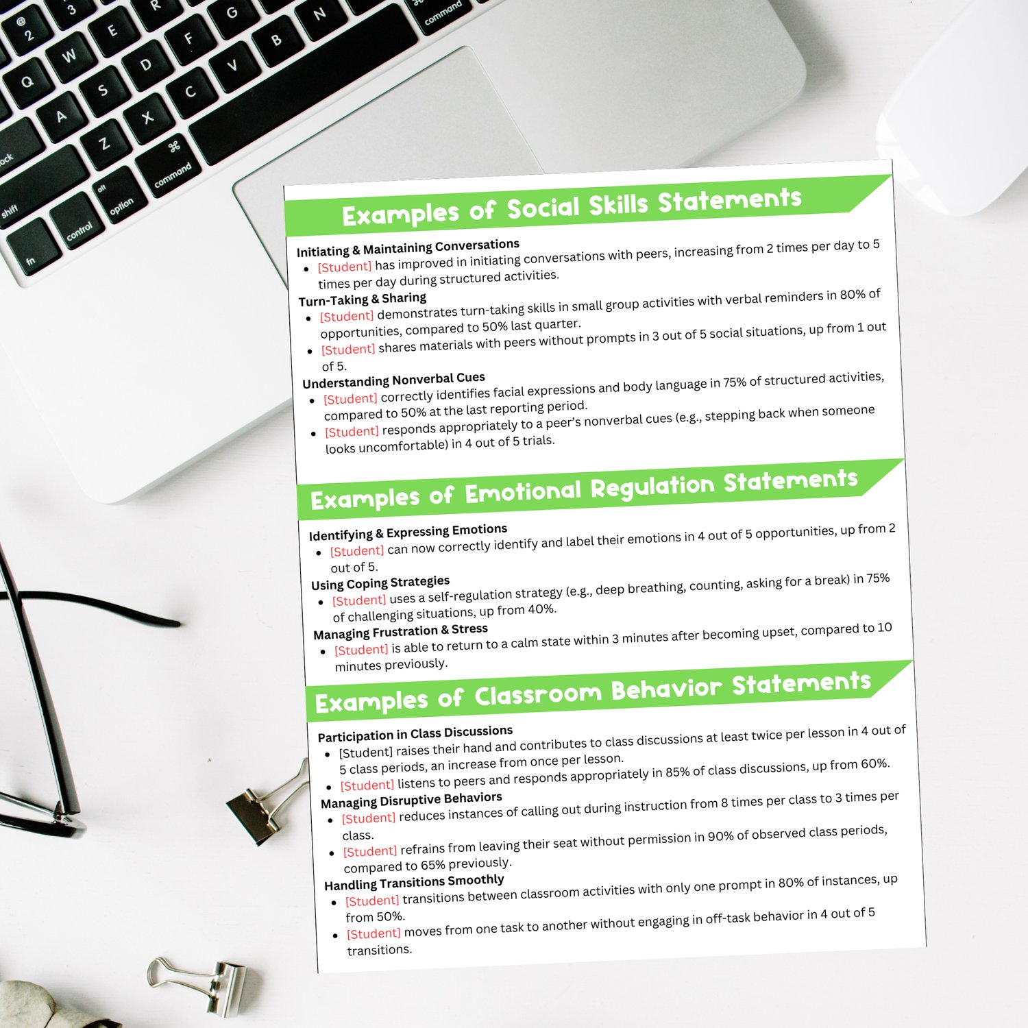 Simple formats and practical examples to document a student’s social skills, peer interactions, and participation in group settings.