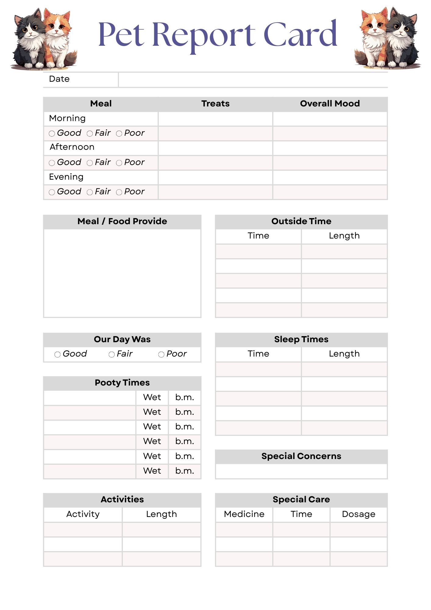 Keep your cat happy and healthy with this easy-to-use Cat Report Card! 🐱 Track meals, treats, litter box use, mood, naps, outdoor time, and more. Perfect for pet sitters, cat owners, or catteries. Download this printable daily care sheet to stay on top of your feline friend’s routine.