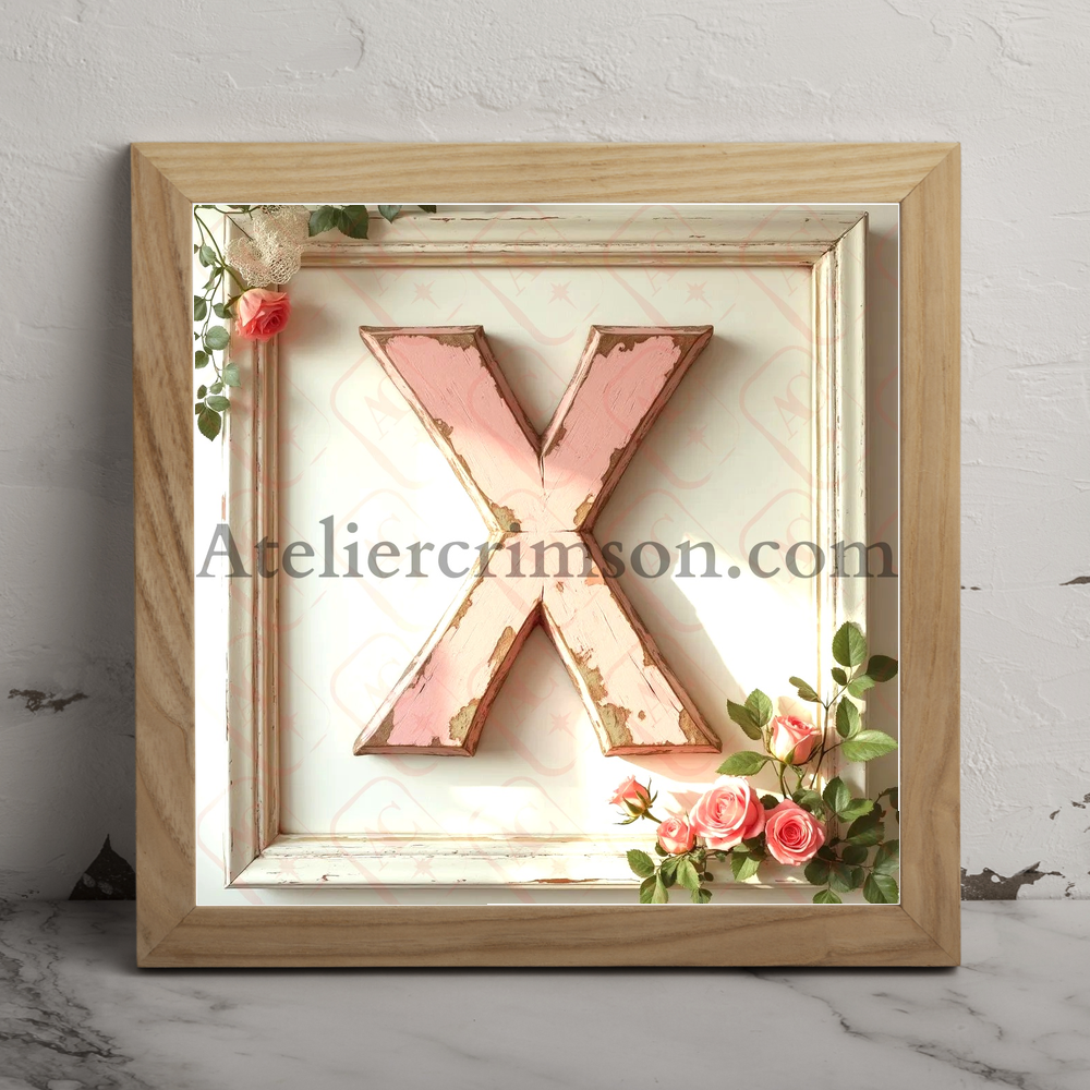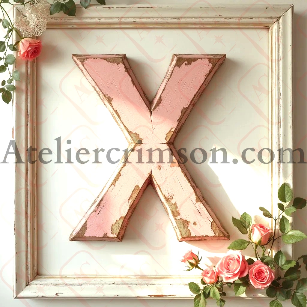 The letter X pink and shabby chic This charming series presents the alphabet reimagined in a delightful shabby chic style. Each letter is crafted from weathered pink wood, standing proudly against a soft cream background. The collection exudes a romantic, vintage atmosphere with its elegant typography and subtle decorative elements.