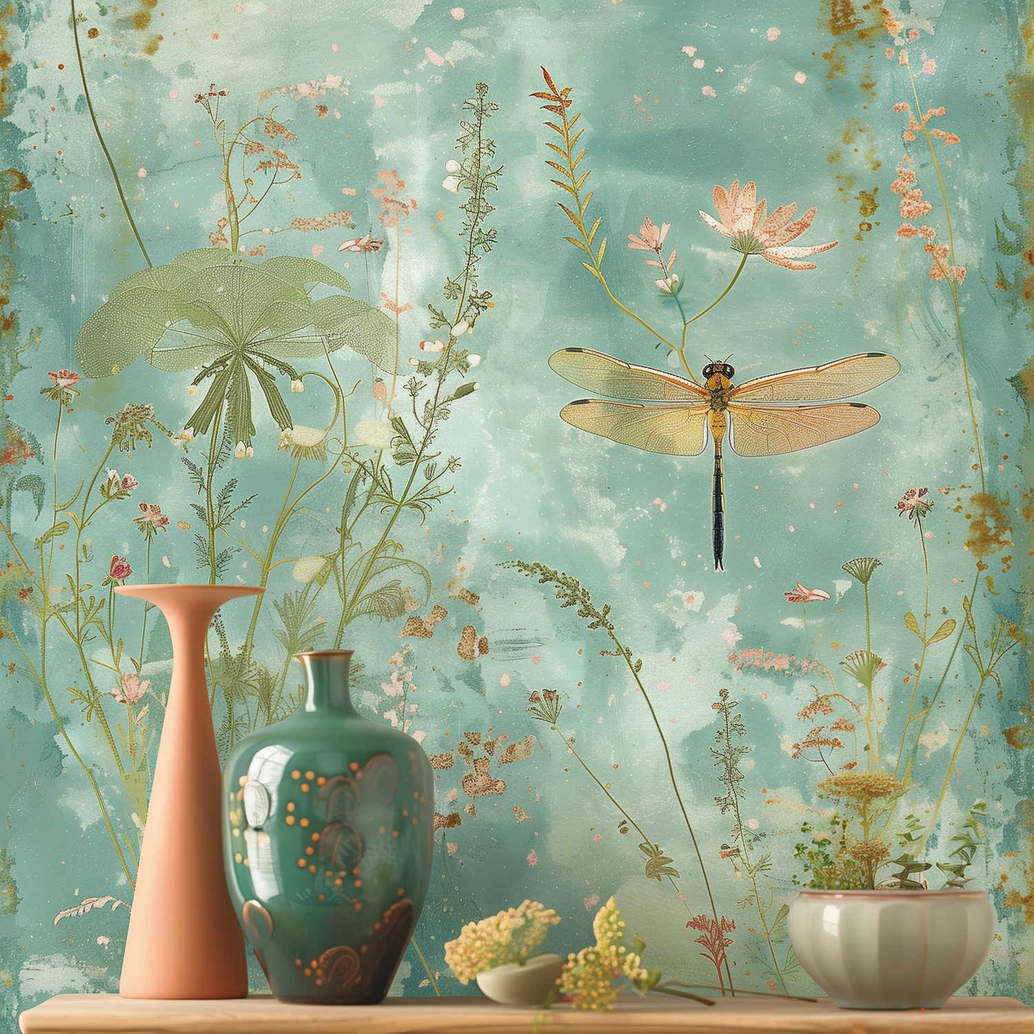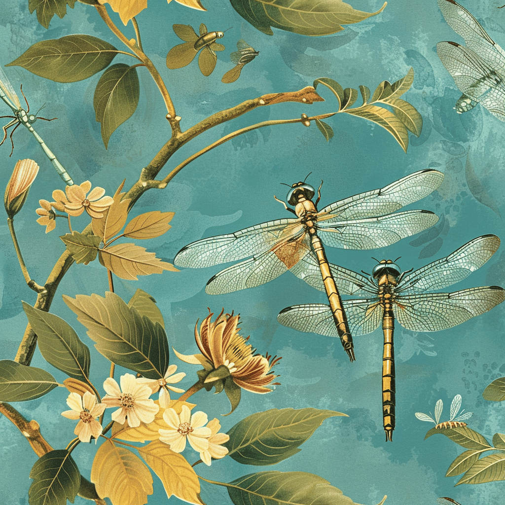 The devil´s darning needle refers to dragonflies due to their long, slender bodies and the way they dart and weave through the air. In love with summer thinking for wallpaper design for your home to always remind you of the summer feeling. Here is a dragonfly wallpaper for you, as summer comes the dragonflies, butterflies, flowers and fireflies all come together as a family making everything special and lovely.
