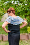 A garter crescent with some elongated stitches gives you a good size even from one skein of yarn, and the stockinette ruffle adds a bit of playfulness to it.