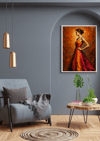 This painting radiates elegance and intensity, capturing a woman poised in grace and strength. Her gown, a stunning blend of crimson, magenta, and golden orange, flows like liquid fire, blending with the swirling background that mirrors the colors of a setting sun.
