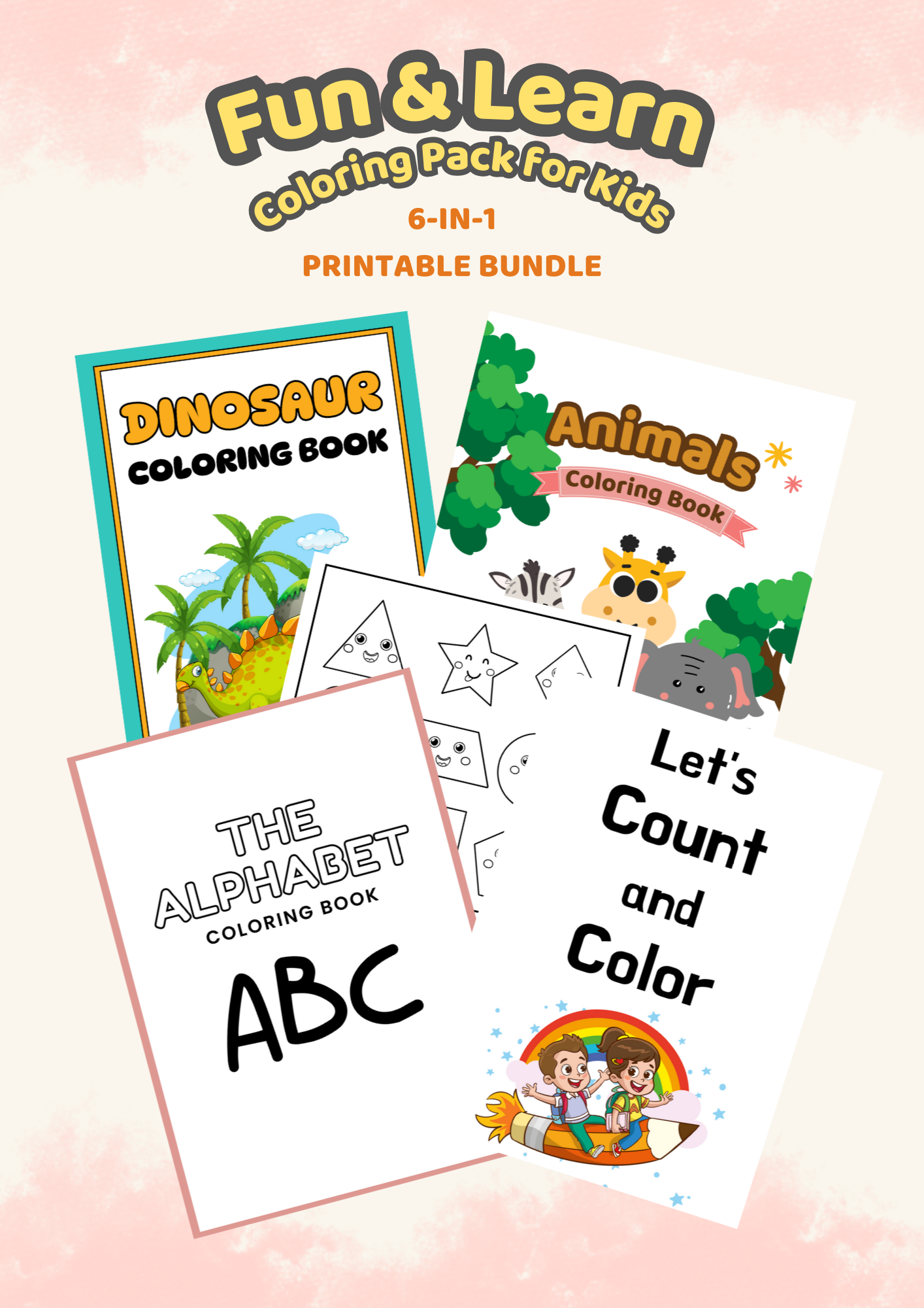 Kids 6-in-1 Coloring Book Bundle | Dinosaurs, Animals, Vehicles, Alphabet, Numbers & Shapes (Printable PDF Pack)