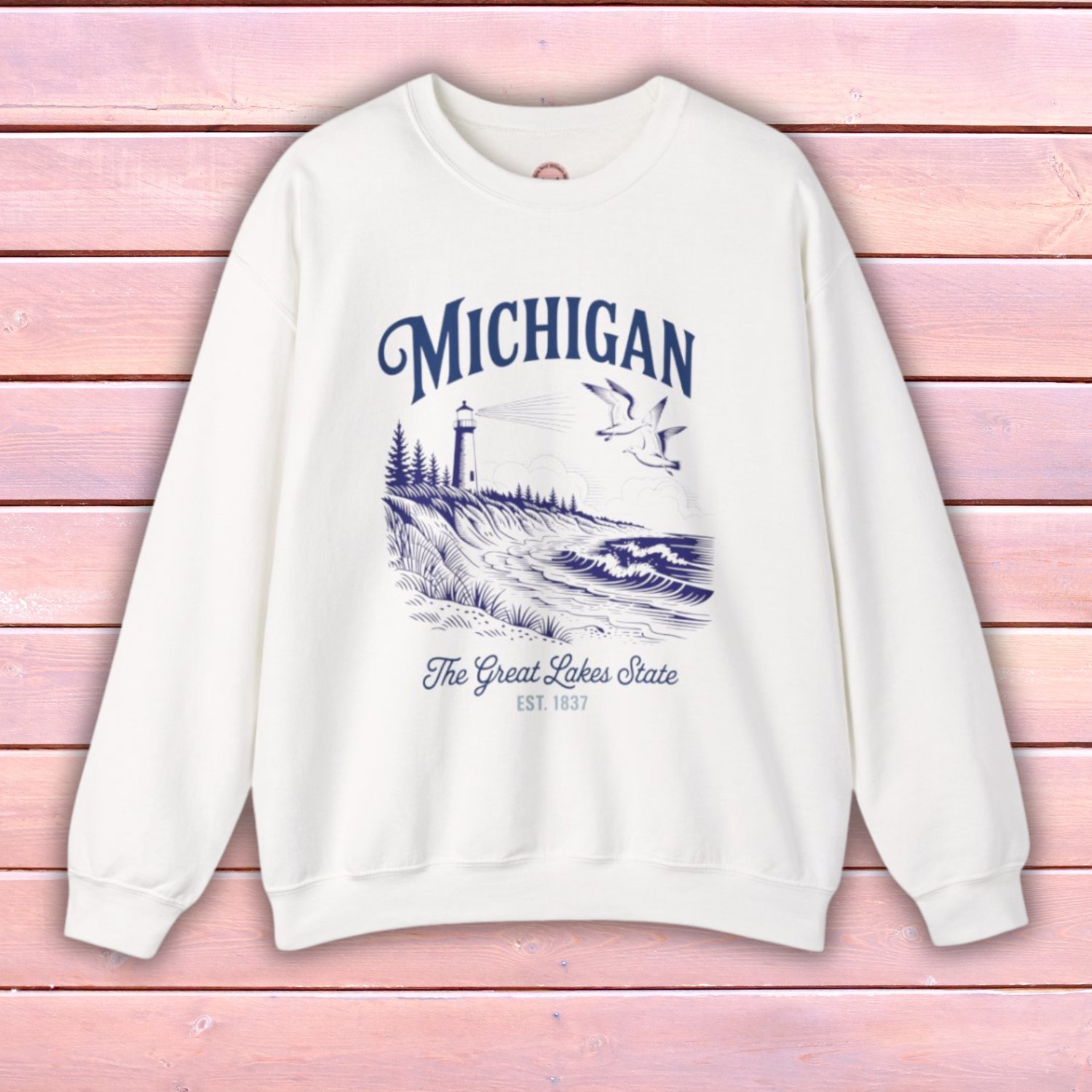 Michigan State Pride Unisex Crewneck Sweatshirt – Cozy Vintage-Style Gift for Michiganders, Great Lakes Comfort Apparel