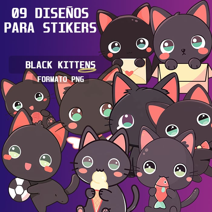 Pack of 9 black kitten sticker designs in PNG format. Perfect for custom stickers, printing, sublimation, DTF, DTG, and more. Instant digital download, ready to use for all your creative projects.