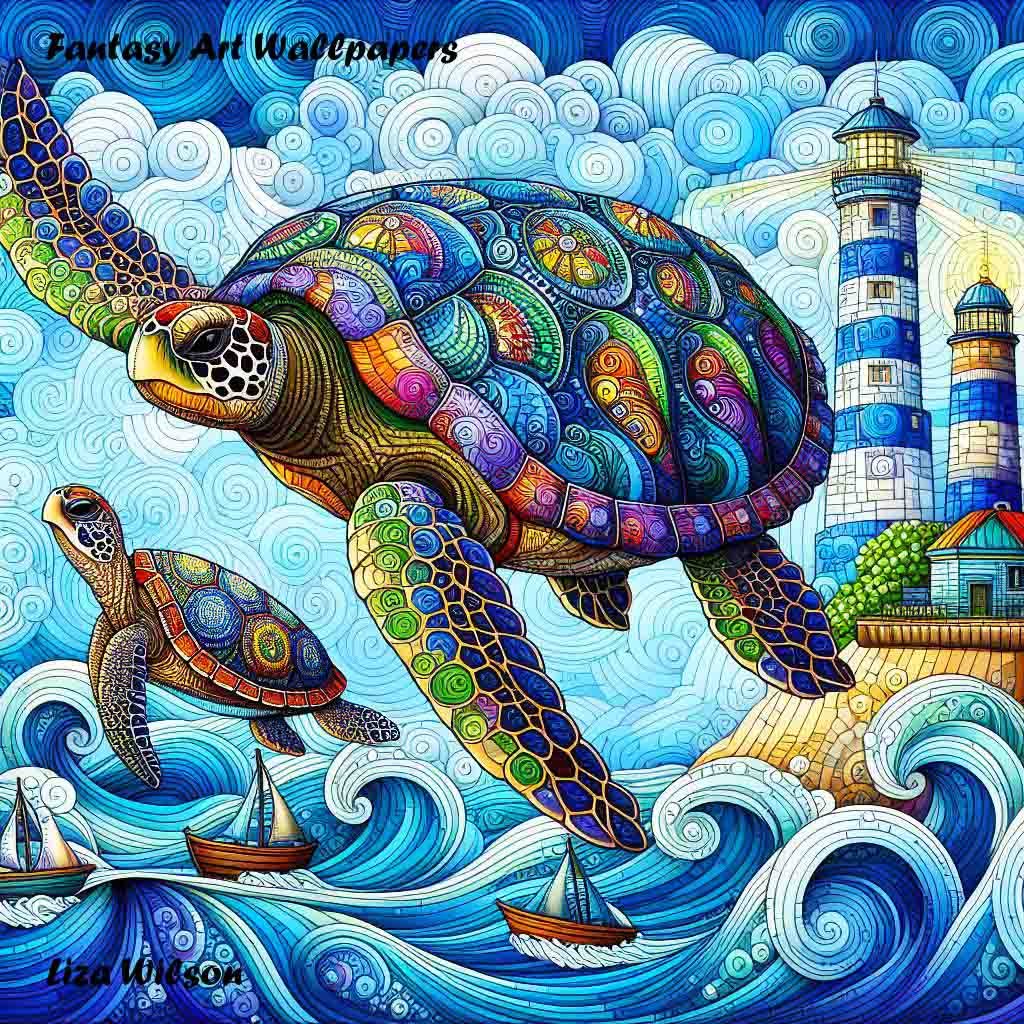 Colourful giant sea turtle & baby sea turtle spirograph style jumping through curly frothy waves. There is a lighthouse, ships & a little beach.