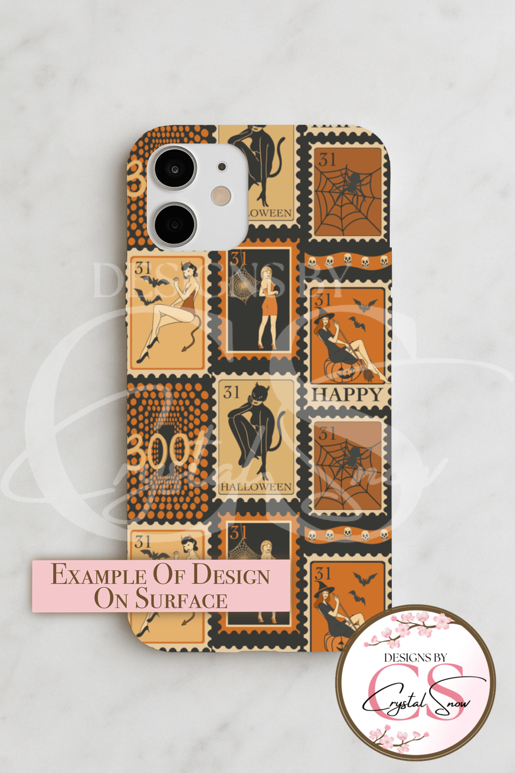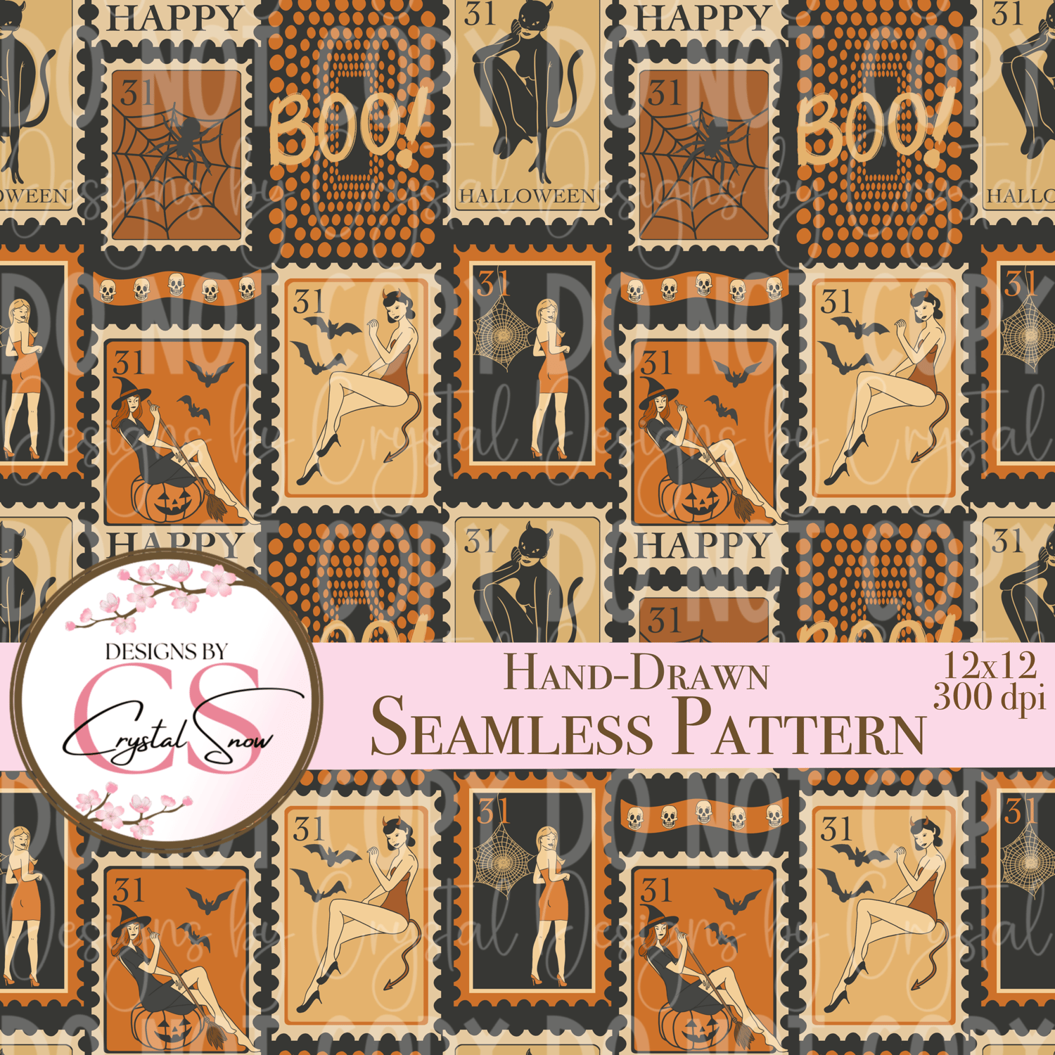 Channel spooky retro vibes with this vintage Halloween pin-up seamless pattern—packed with sassy witches, bats, webs, and stamps in classic Halloween hues!