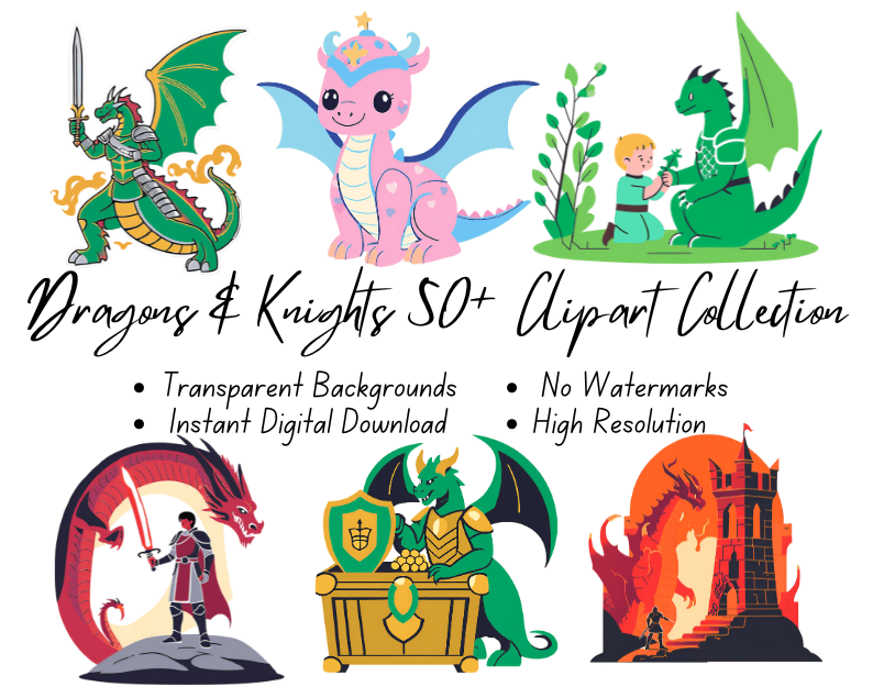 Dragons & Knights 50+ Clipart Collection | High-Resolution Digital Printables | Instant Download | No Watermark