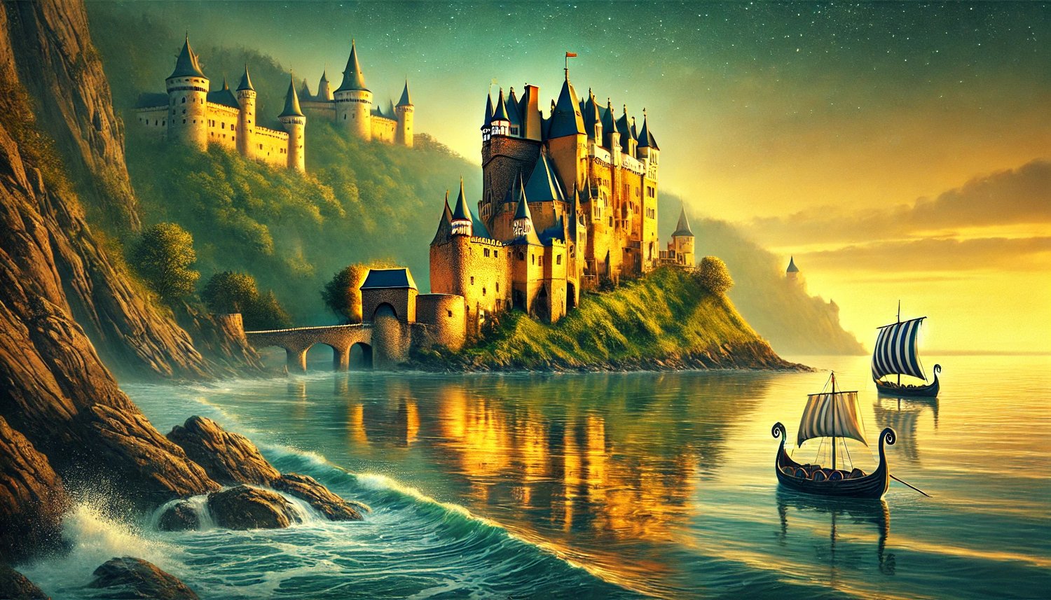 In the foreground, two Viking-style ships with black-and-white sails gracefully glide through the calm waters, evoking a sense of medieval exploration and grandeur. The background features rolling hills covered in mist, additional castle towers, and a starry night sky, adding depth and mysticism to the scene.