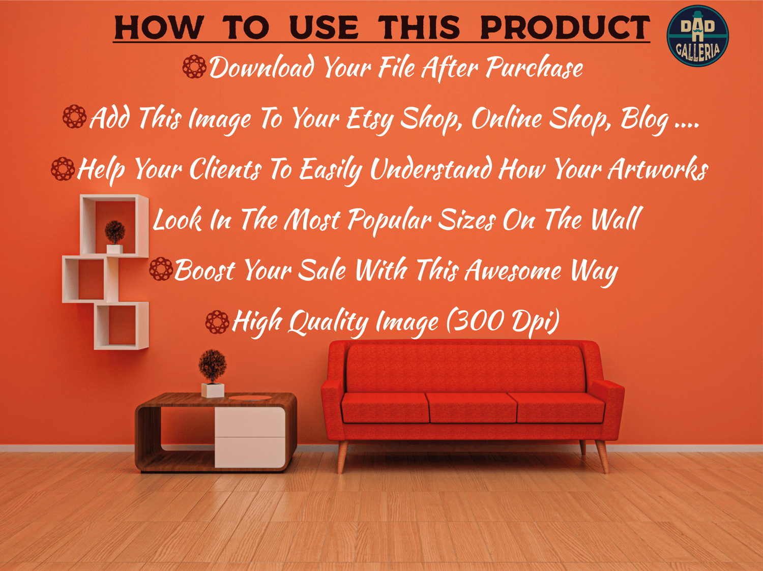Papa Printable offers WALL ART SIZE GUIDE TEMPLATE in different sizes. That will help your clients easily understand how your artworks look in the most popular print sizes on the wall.