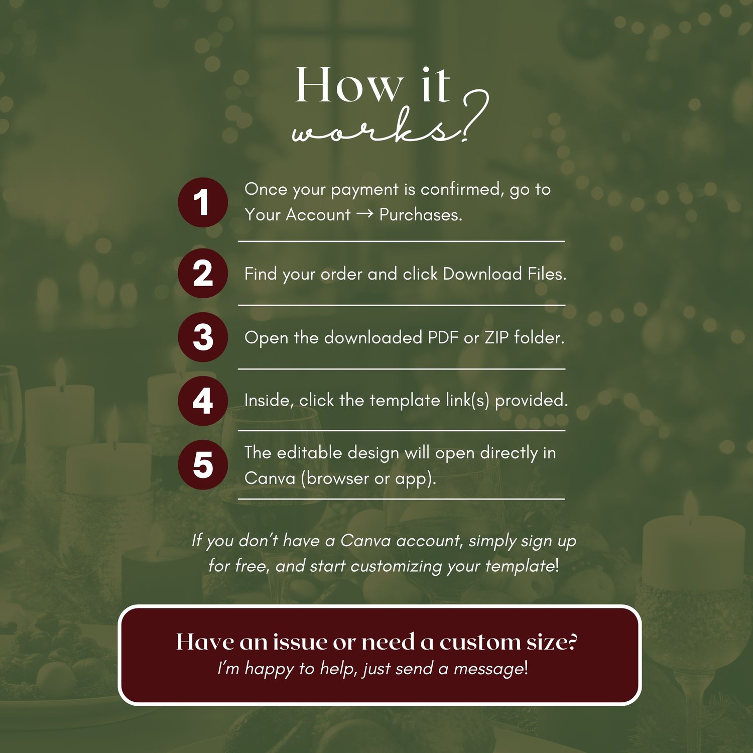 Perfect for holiday dinner parties, festive Christmas gatherings, family celebrations, or cozy winter dinners, this digital invite makes planning and sharing your event effortless and stylish.