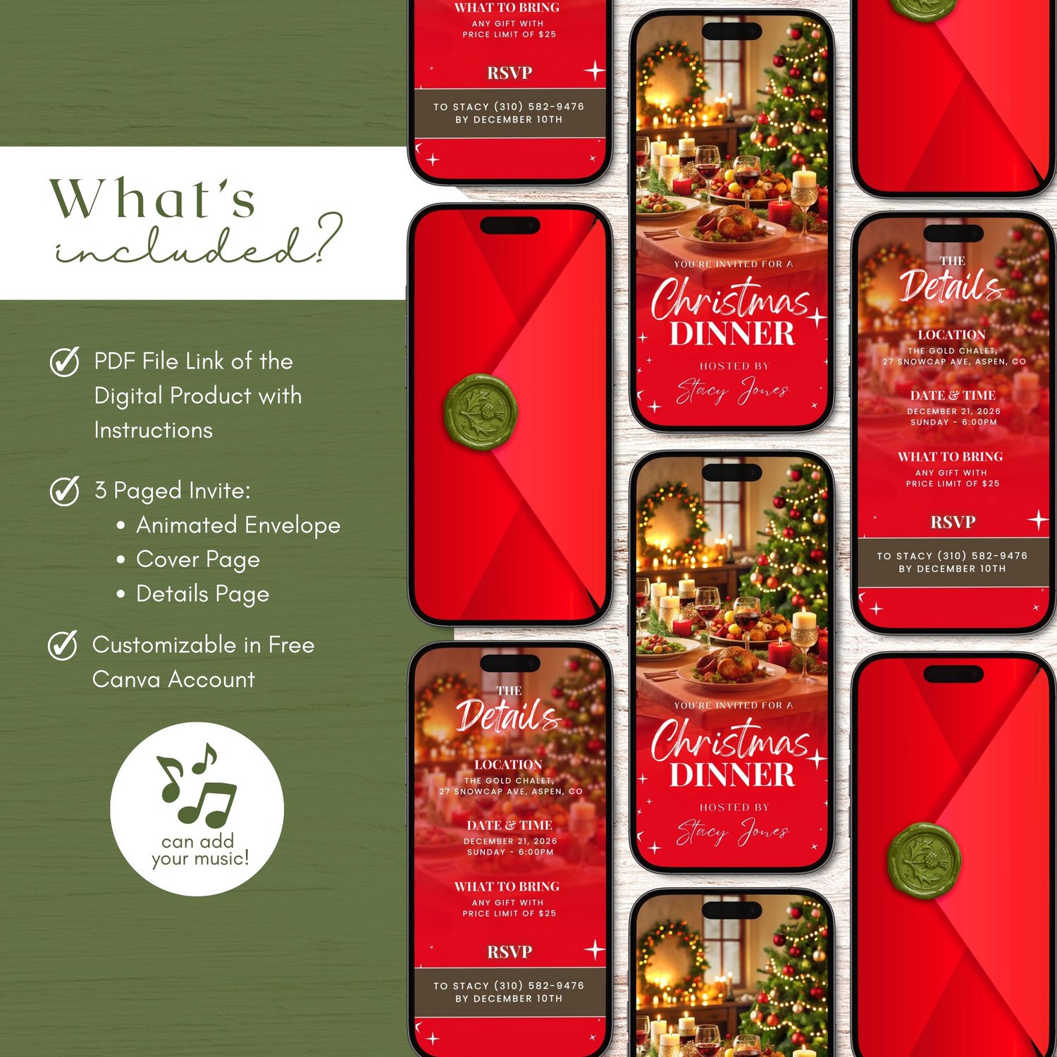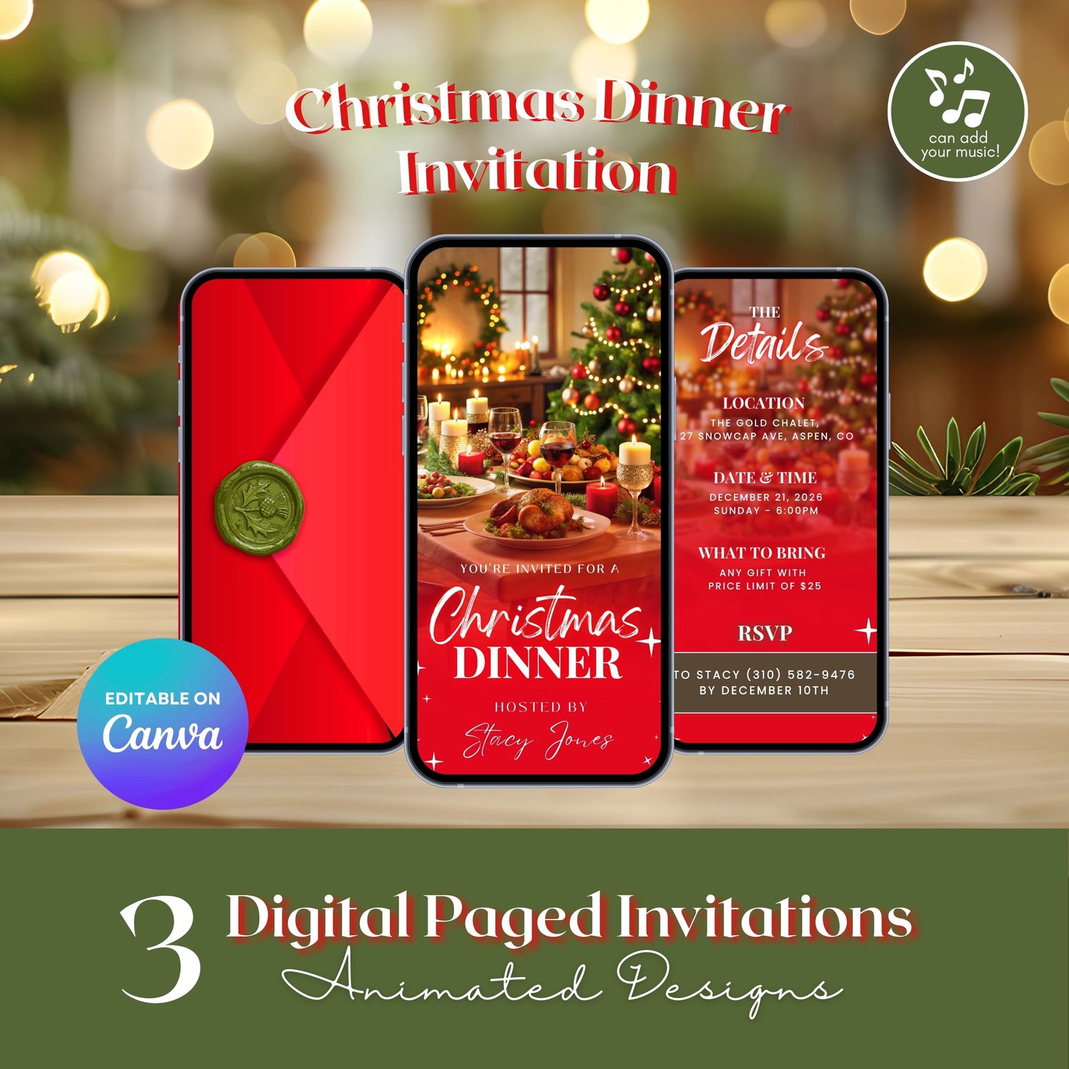 ⭐ Christmas Dinner Invitation Template | 3 Editable Mobile Canva Pages ⭐