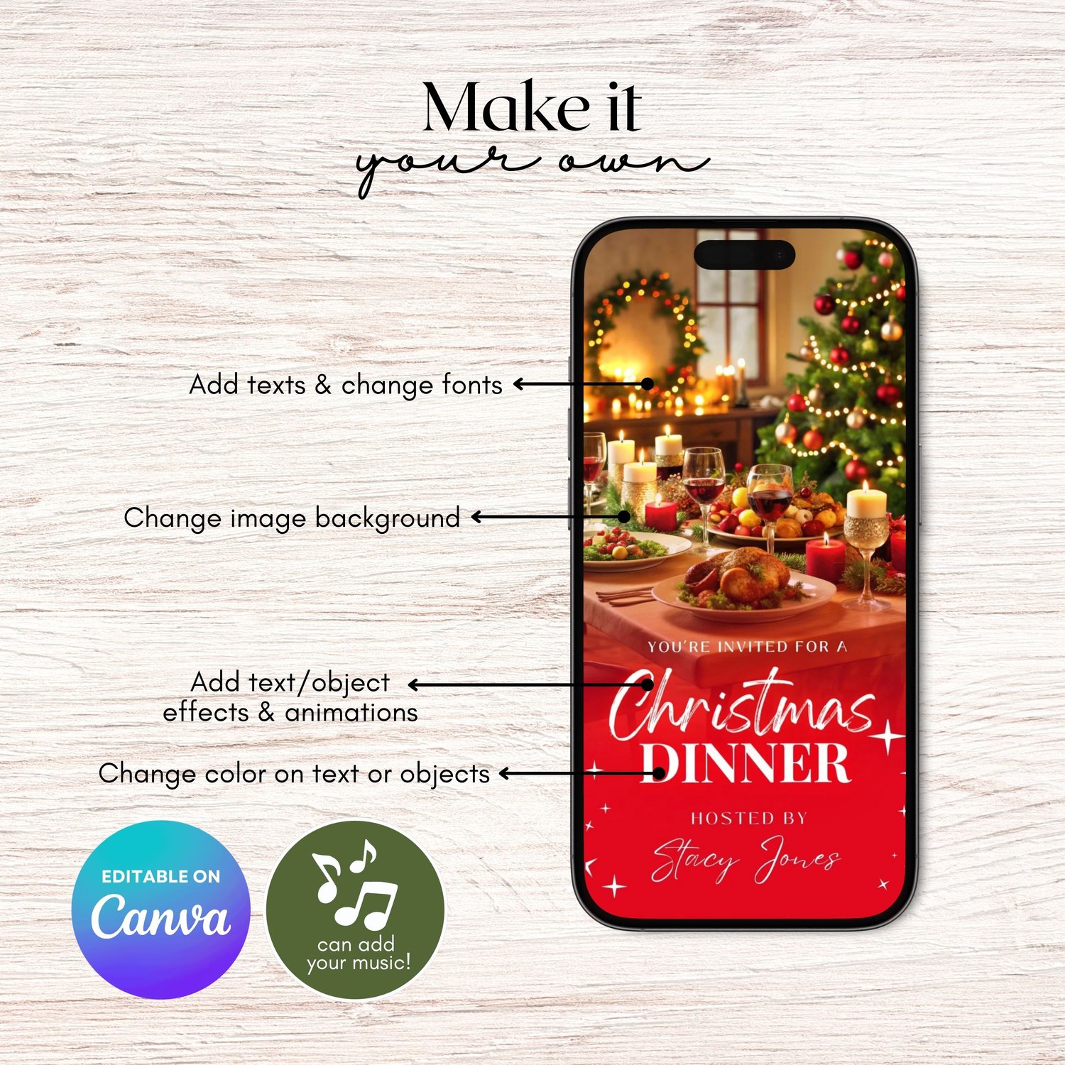 Digital Christmas Dinner Invitation 2025, Christmas Brunch Invite, Xmas Party Evite, Merry Christmas Party Invite (Animated Canva Template)