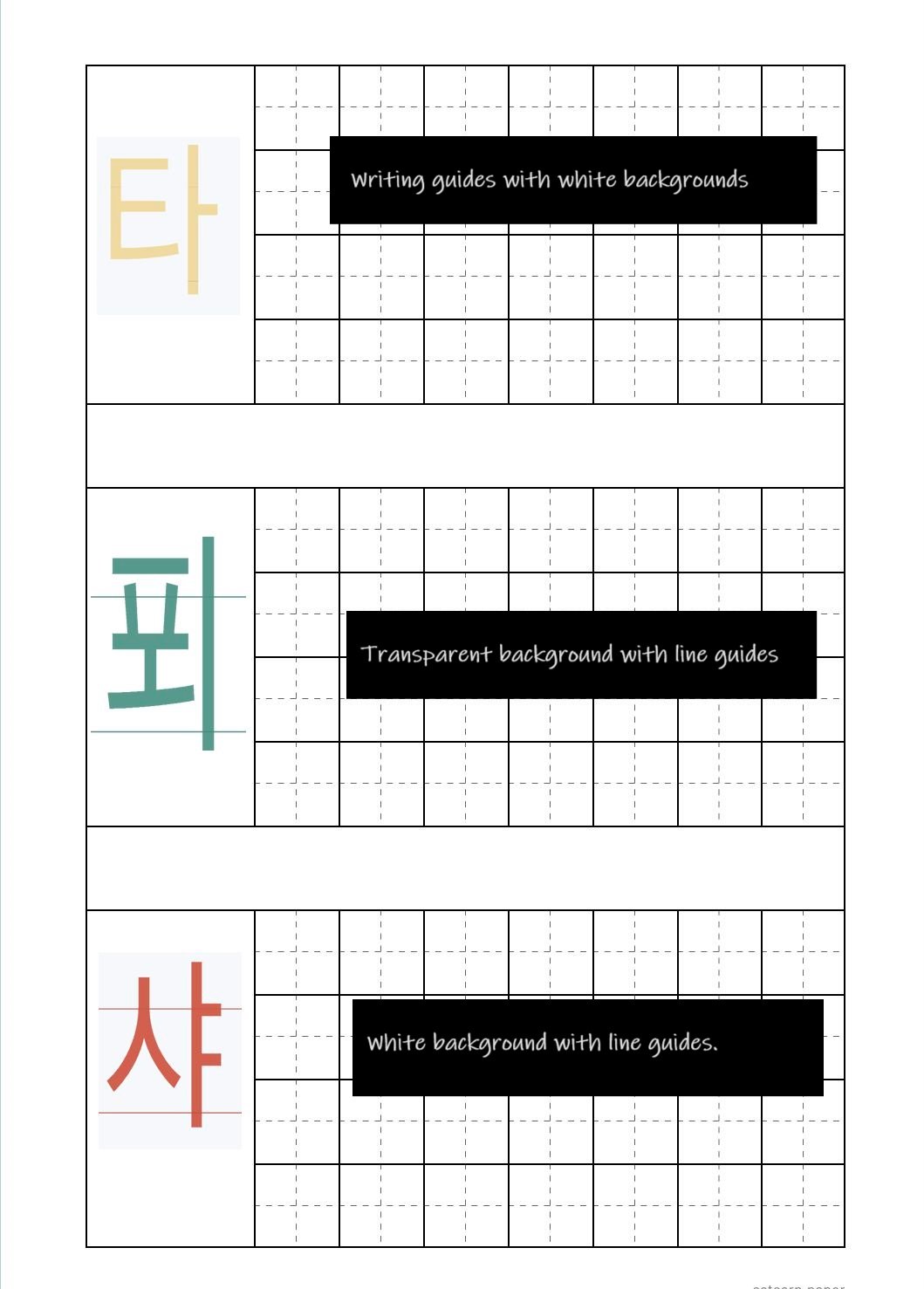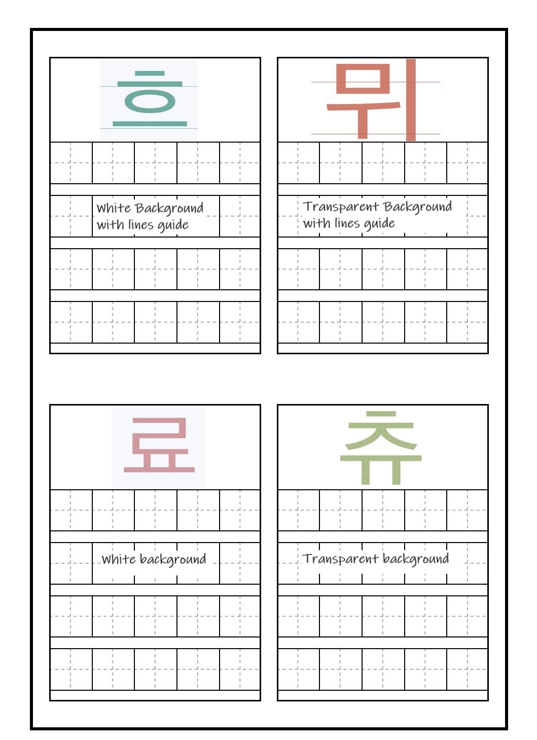 Learn how to write and read with these Korean Hangul stickers and writing guides. They help you write Hangul properly. You can add them to your digital planners to remind yourself to practice how to write and study Hangul. Before you know if you will be able to read and write Korean in no time. You can also print them out and put them anywhere you like.