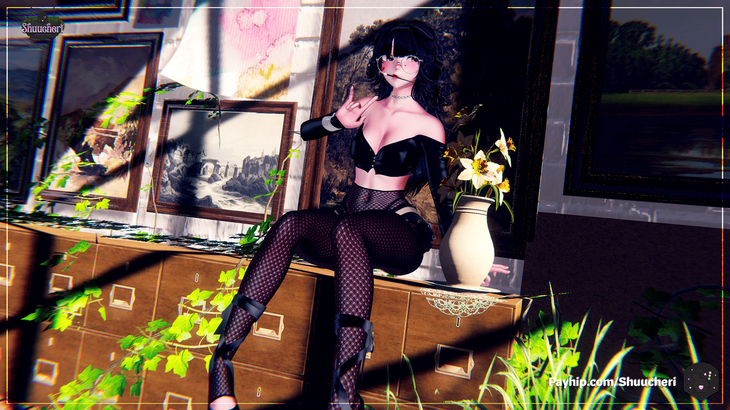 Frog Hat, Paint Brush, Frog Accessories, Fishing Rod, Eyes, Tops/Heels/Glasses/Skirts, Top/Skirt/Accessories, Hair/Lashes/Haircards, Fishnets, Wetskin, Body/Head texture, Makeup, Body, Head, Face tracking addon, Poiyomi Shader, Better audio, Lollipop, Gogo Loco, Adjerry FT Template, Boots, Tattoos, Matcaps, Hair Alpha, Bottoms/Acc