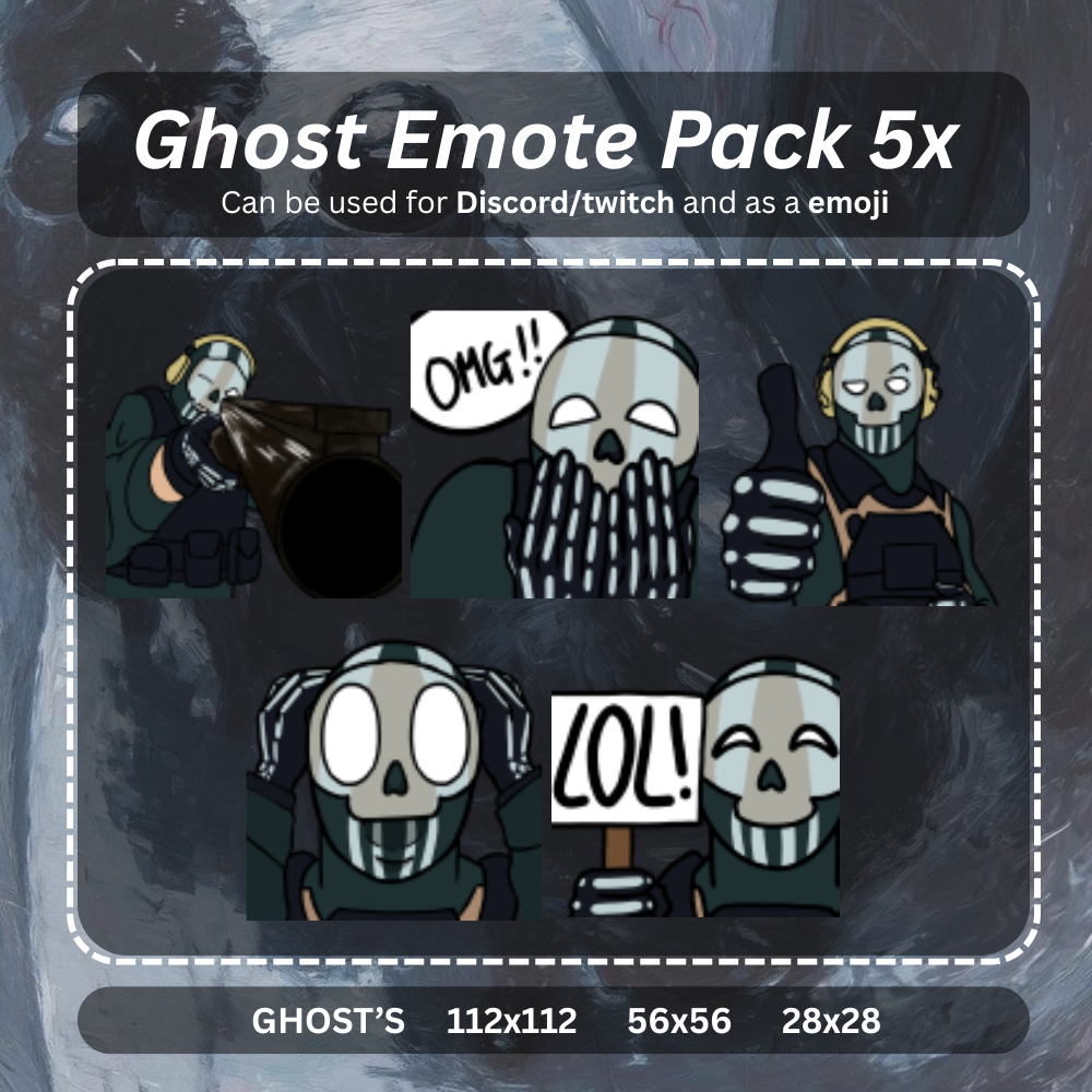 Bring your chat to life with this Ghost-inspired emote set! Perfect for Discord, Twitch, and as emojis, this pack includes 5 unique high-quality emotes featuring fun and expressive reactions: